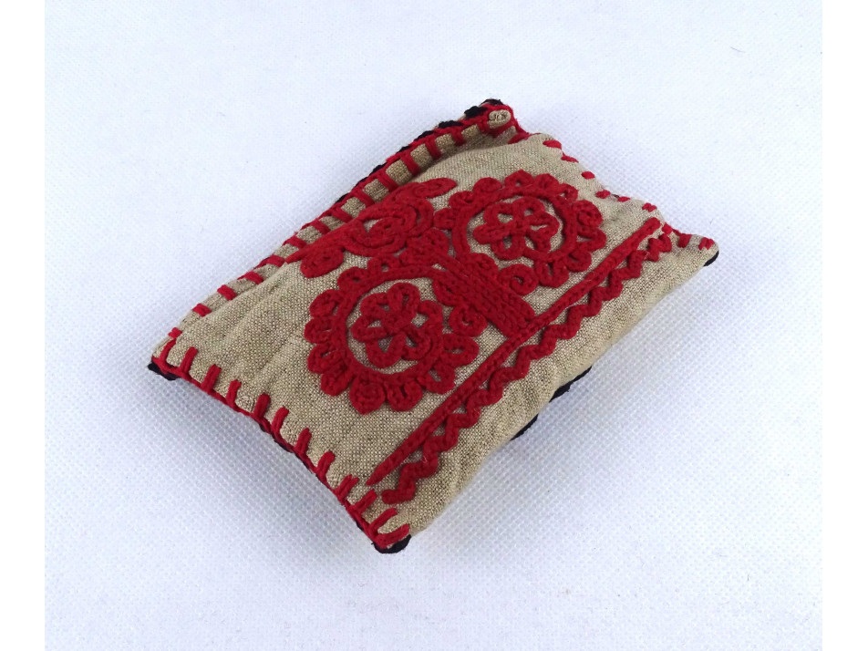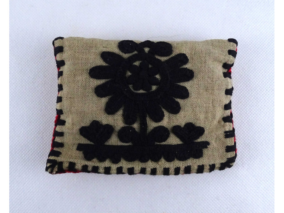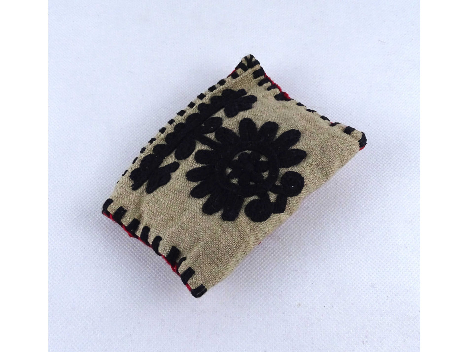 Régi hímzett kétoldalas kalotaszegi piros fekete mintás mini párna 14 x 10 cm