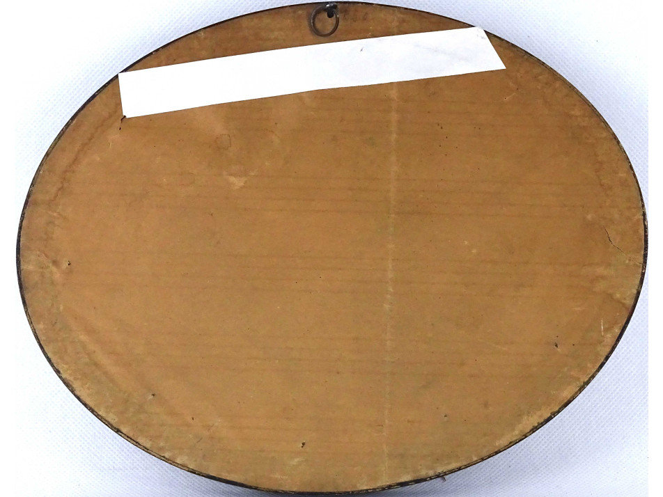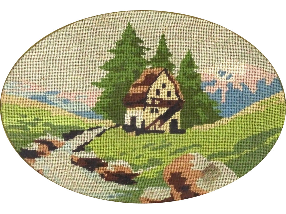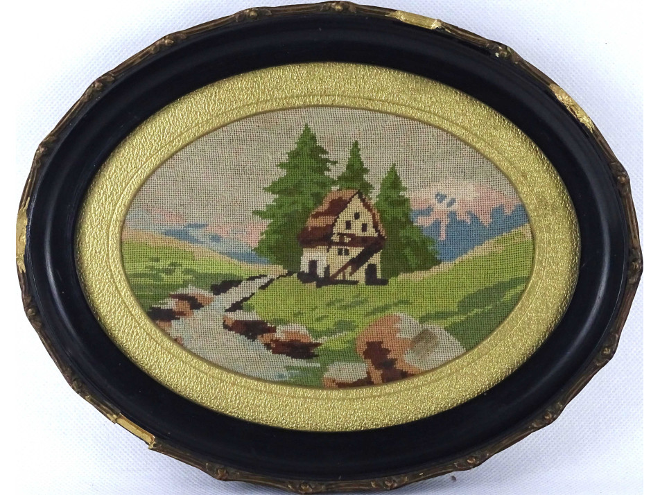 Régi, részletgazdag, színes, finom kézimunka, tűgobelin tájkép házzal, arany színű paszpartuban, üveglap mögött, szép állapotú ovális, aranyszélű fekete keretben. Falra akasztási lehetőséggel rendelkezik. A kereten több sérülés található.
