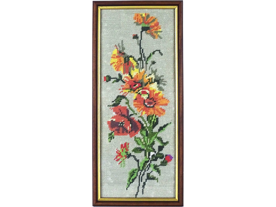 Régi, hibátlan állapotú fa keretben, üveglap mögött található, virágcsokrot ábrázoló gobelin falikép.