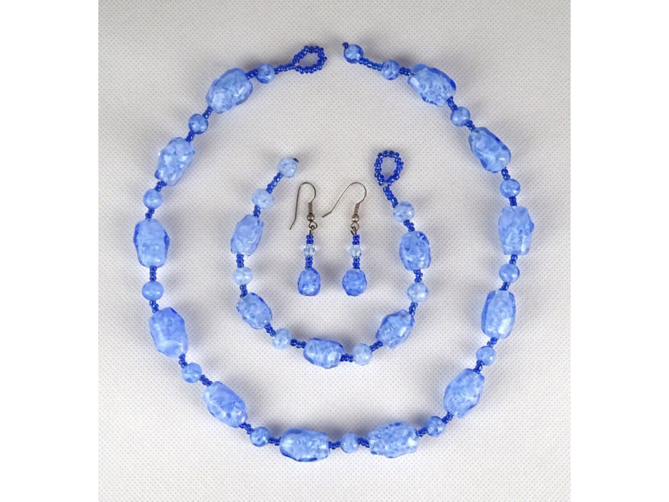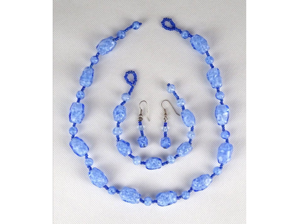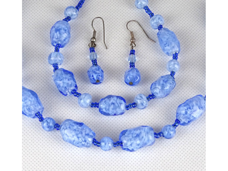Hibátlan állapotú gyönyörű kék-fehér fújt üveggel és apró gyöngyökkel díszített ékszer szett.