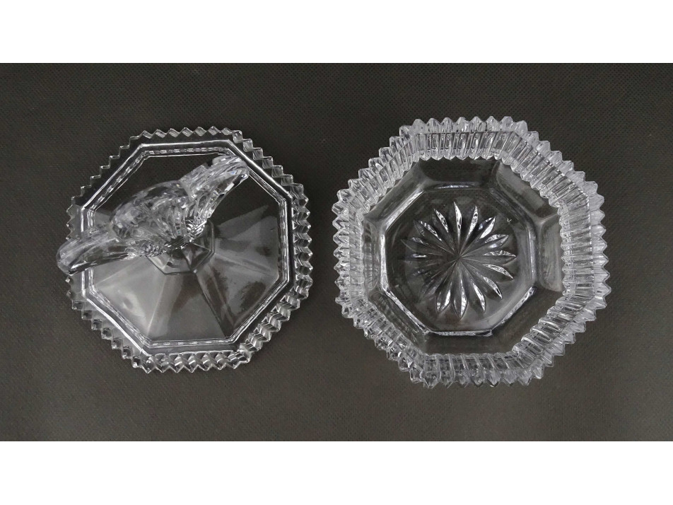 Régi, nyolcszög alakú üveg cukortartó, cukorkínáló vagy gyűrűtartó, ékszertartó bonbonier halfarkat formázó fogantyúval.