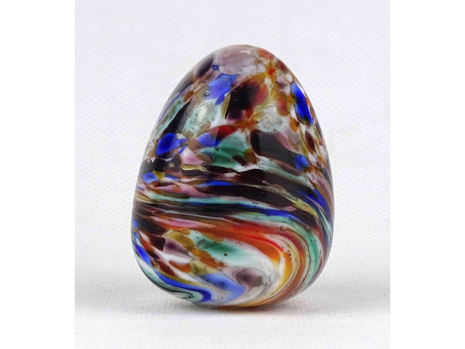 Régi, üreges, rétegelt, fújtüveg tojás dísztárgy. Az üvegtojás külső rétege gyönyörű színes folyatott mintákkal díszített.