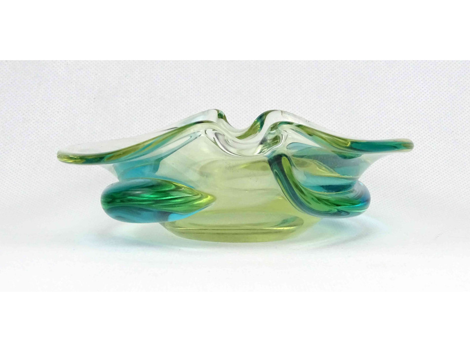 Hibátlan állapotú, vastagfalú, színes, zöld és kék színű művészi üveg, cseh fújtüveg hamutál a XX. század második feléből.