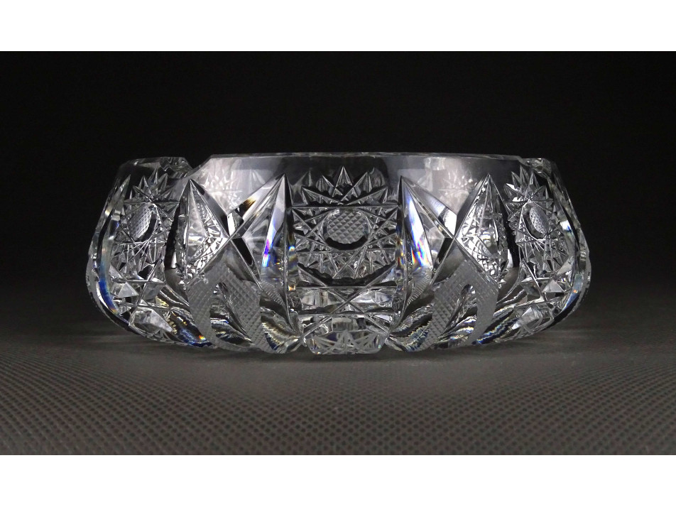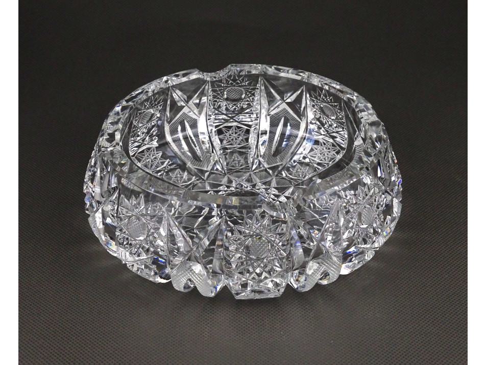 Régi, hibátlan állapotú, csiszolt kristály hamutál, részletgazdag díszítéssel. Négy személyes, négy állásos, vastagfalú kristály hamutál.