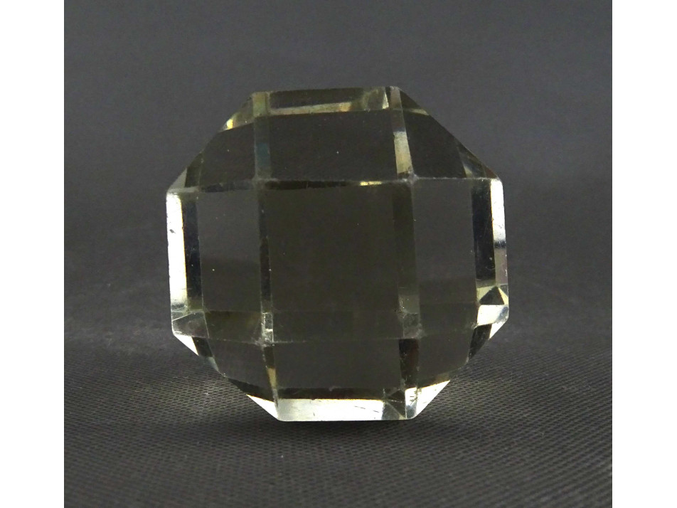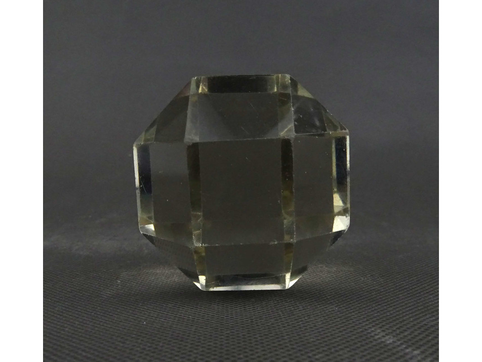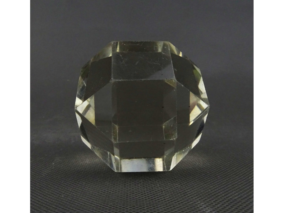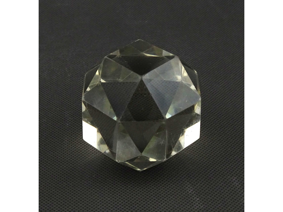 Régi, ép állapotú, 26 síklappal határolt üveg íróasztali kellék, üveg levélnehezék. Élei és sarkai kopottak, karcosak.