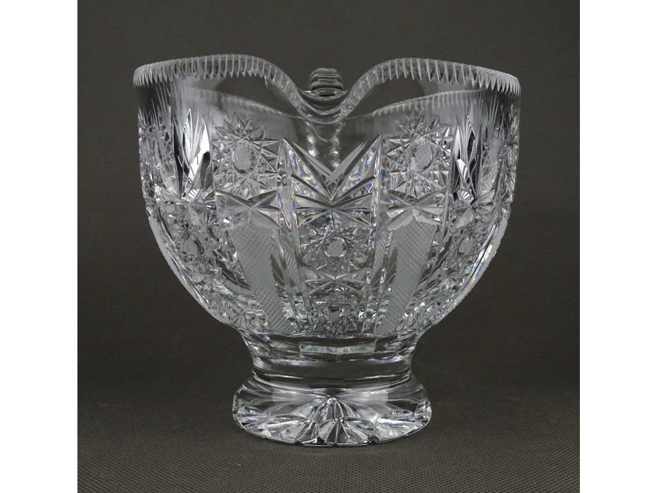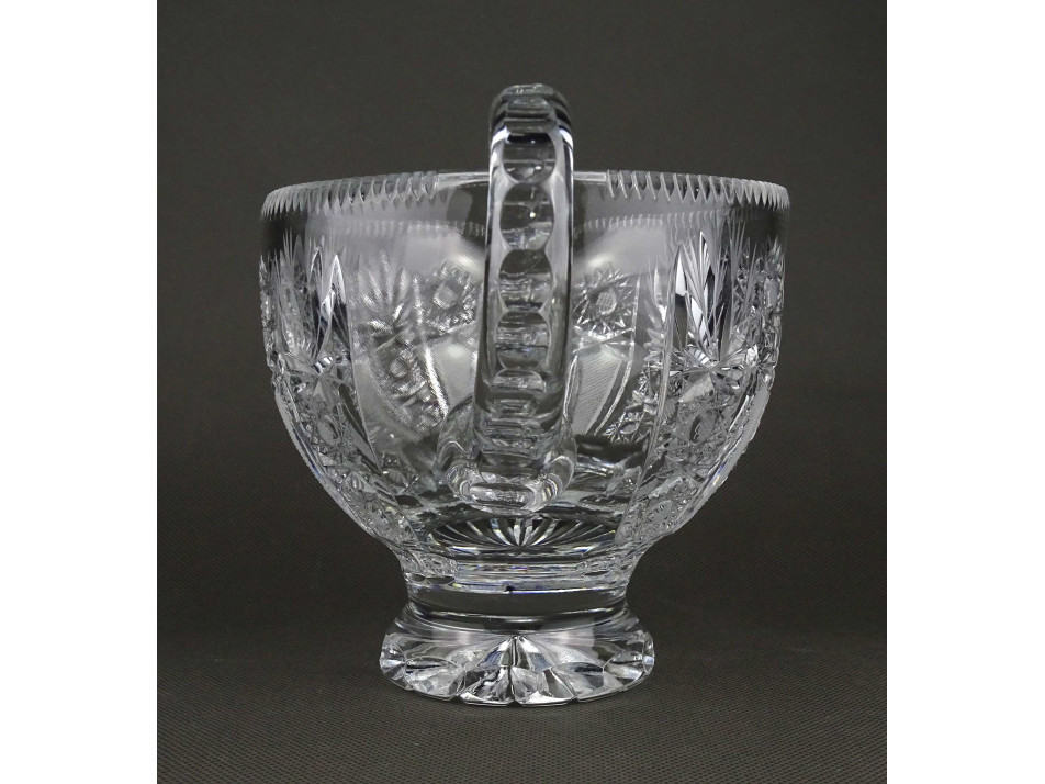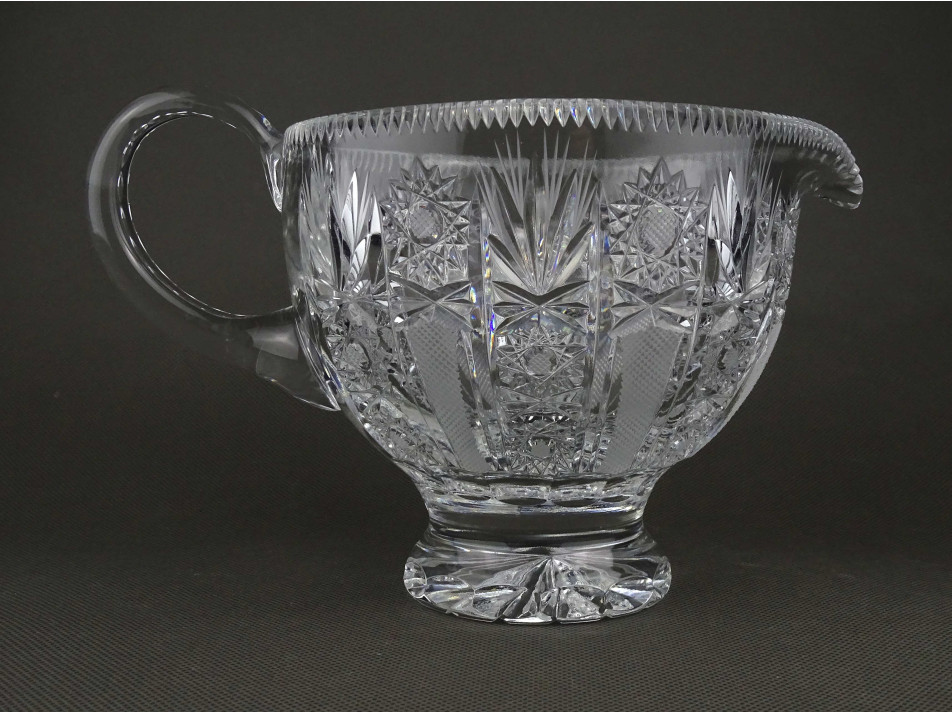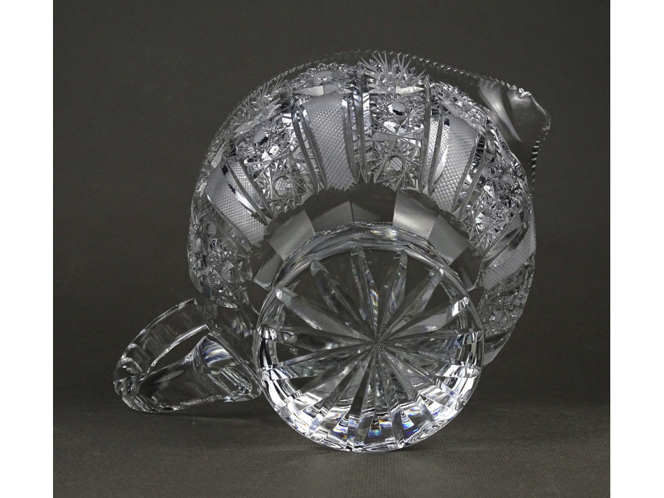 Hibátlan állapotú, gazdagon díszített, vastag falú öblös csiszolt kristály kancsó, kiöntő. Alja, oldala csiszolatokkal gazdagon díszített.