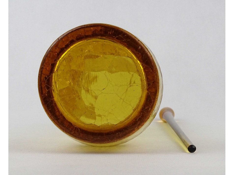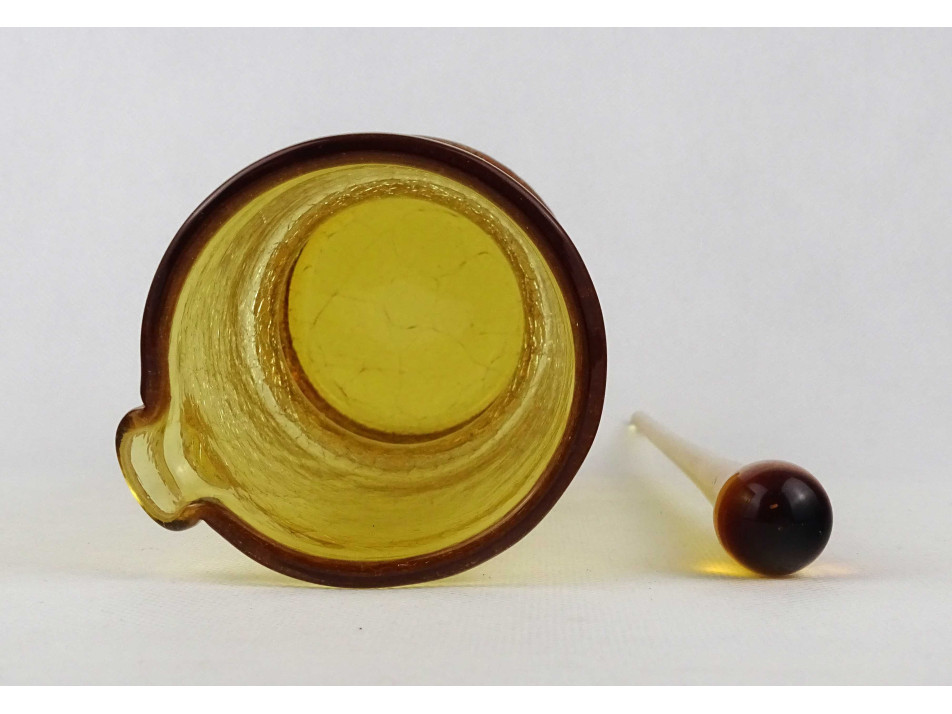 Borostyánsárga színű repesztett karcagi üveg kancsó keverő pálcával 21 cm
