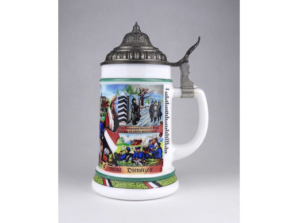Régi, ónfedeles német fehér üveg söröskorsó, sörös kupa. Oldala első világháborús katonai életképekkel és német katonai jelképekkel díszített.