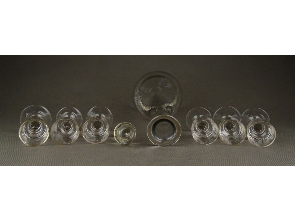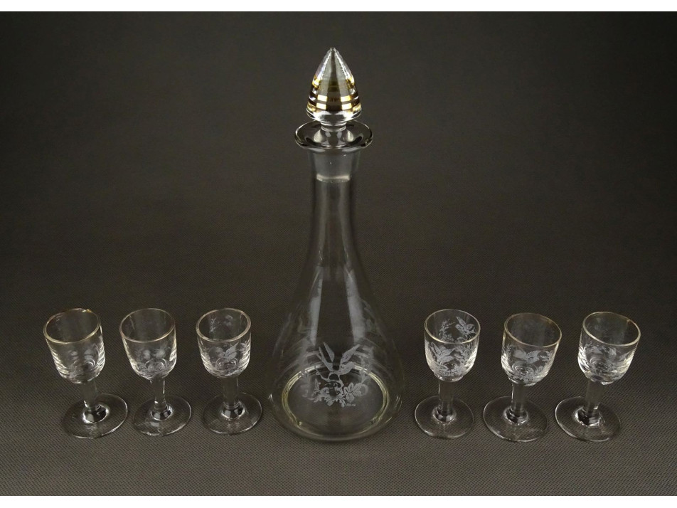 Régi hat darabos madár díszes üveg pálinkás kínáló készlet