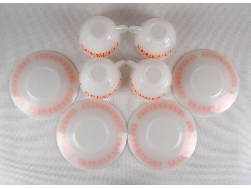 Hibátlan állapotú, tejfehér üveg teáskészlet, narancssárga retro díszítéssel.