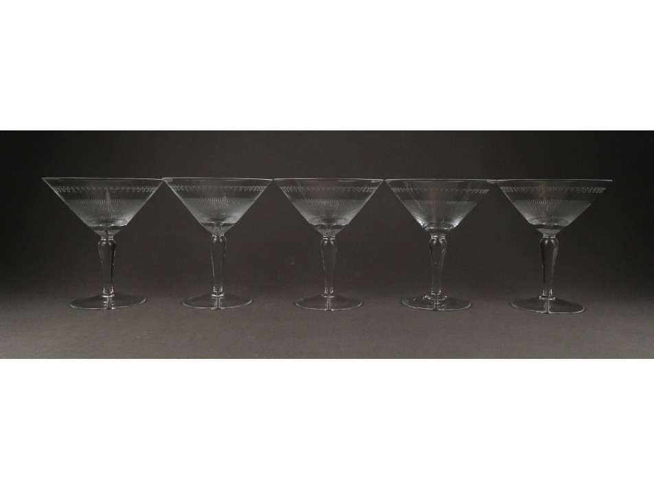 Régi, hibátlan állapotú, elegáns, talpas üveg pezsgőspohár készlet. Oldalán körben spirális mintákkal díszítve. 5 darab.