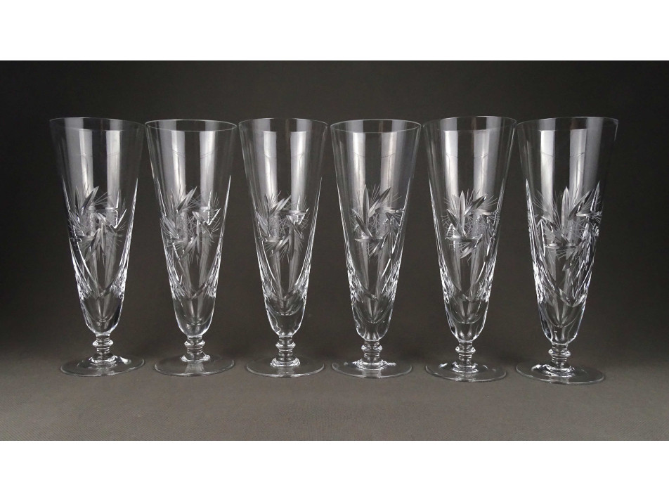 Hibátlan állapotú, csiszolt kristály, talpas sörös korsó, sörös pohár készlet, hat darab.