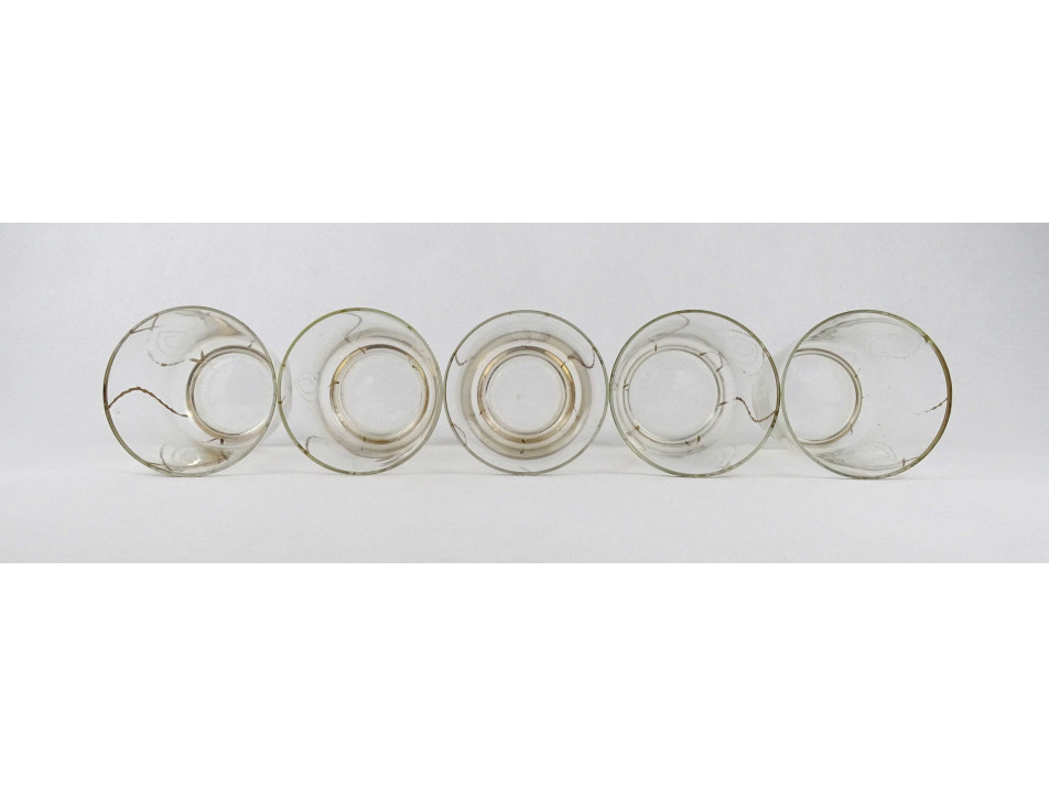 Régi, vékonyfalú, aranyozott fújt üveg pohár készlet, 5 darab. Oldalán kézzel festett, aranyozott díszítés látható.