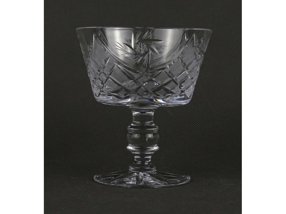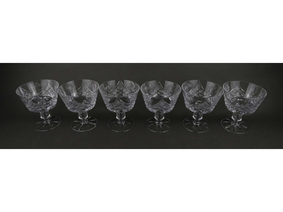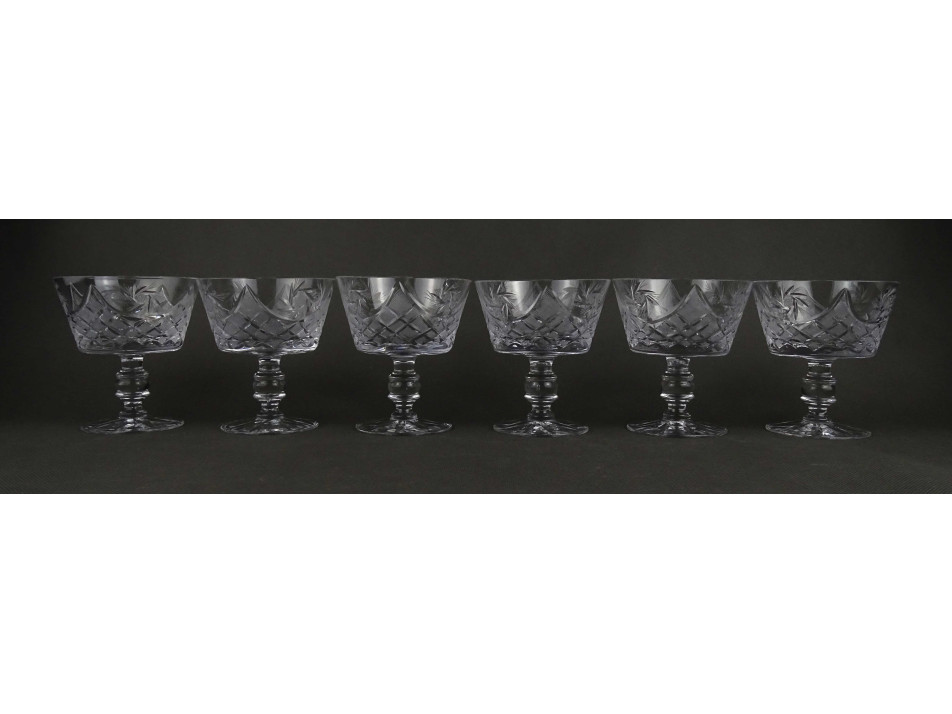 Elegáns, hibátlan állapotú, hat darabos talpas pohár készlet. A poharak oldala finom csiszolt motívumokkal díszített.