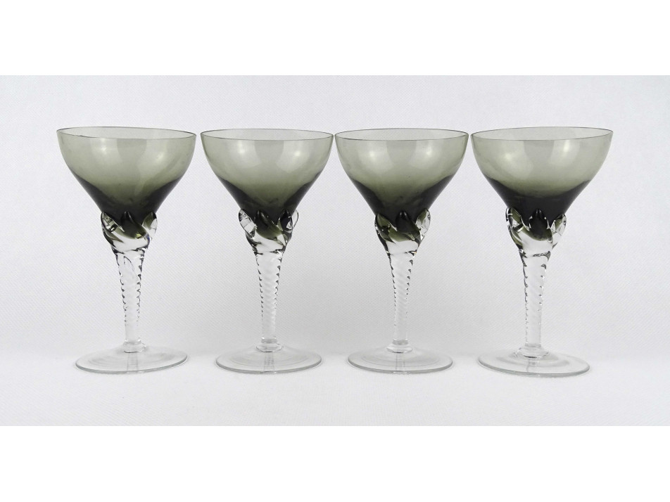 Elegáns, részben füst színű, különleges csavart szárú, talpas üveg boros pohárkészlet, 4 darab.