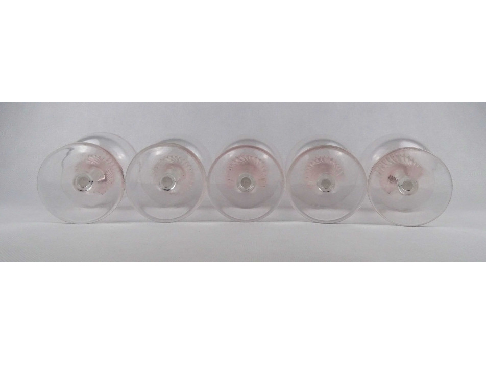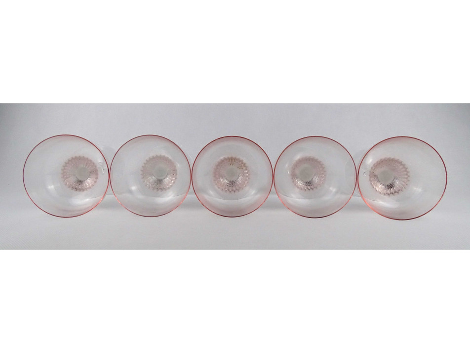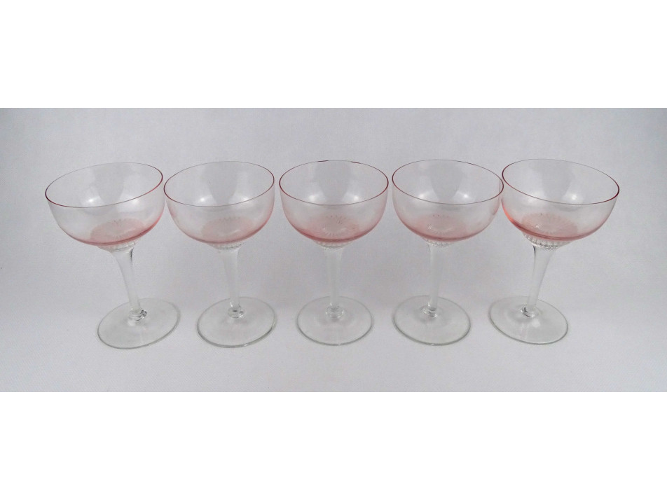 Hibátlan állapotú, öt darabos, elegáns rózsaszín, talpas pezsgős üveg pohár készlet.