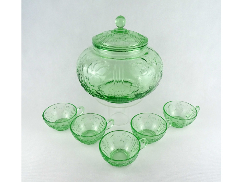 Régi, szép állapotú, zöld színű préseltüveg bólés készlet, pohár készlet. A poharak és a kínáló oldala szőlőlevél és szőlőfürt és eper motívumokkal díszített.