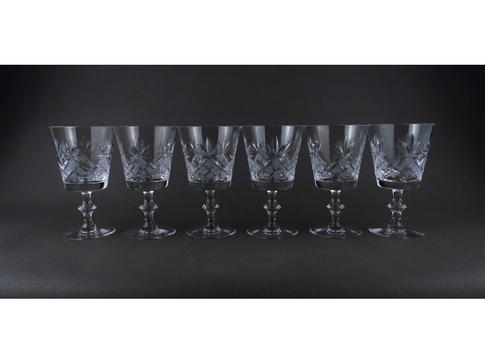 Régi, hibátlan állapotú, elegáns talpas boros, vörösboros kristályüveg pohárkészlet, oldalán körben finom csiszolt díszítésekkel, 6 darab.