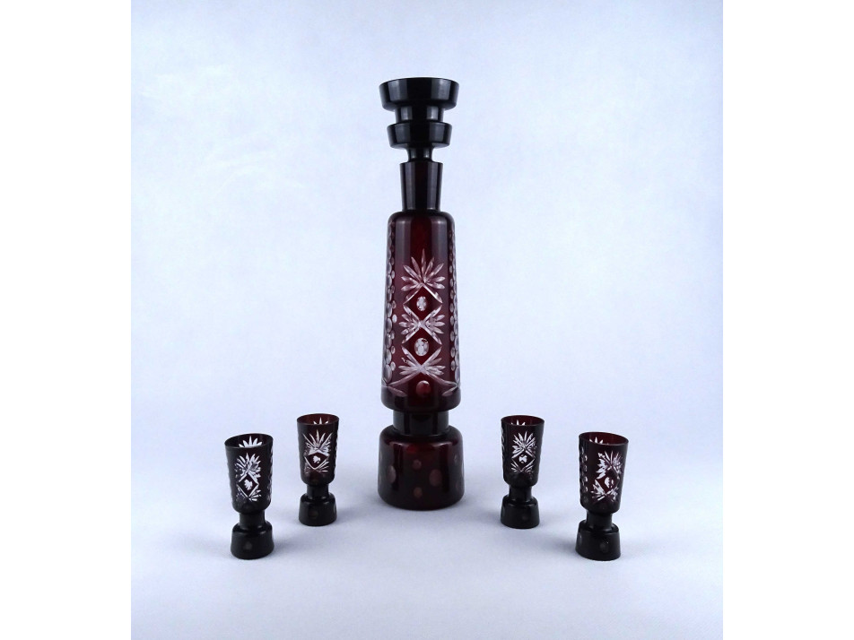 Régi, hibátlan állapotú, bordóra színezett, csiszolt üveg, italkínáló, pálinka kínáló készlet, dugós palack négy röviditalos pohárral. Asztali italkínáló, rövidital, likőr kínáló.