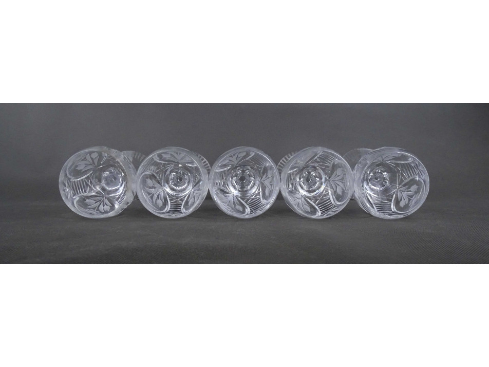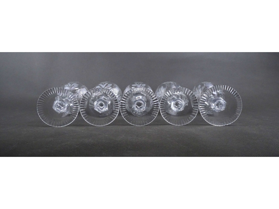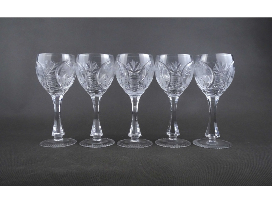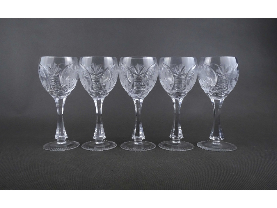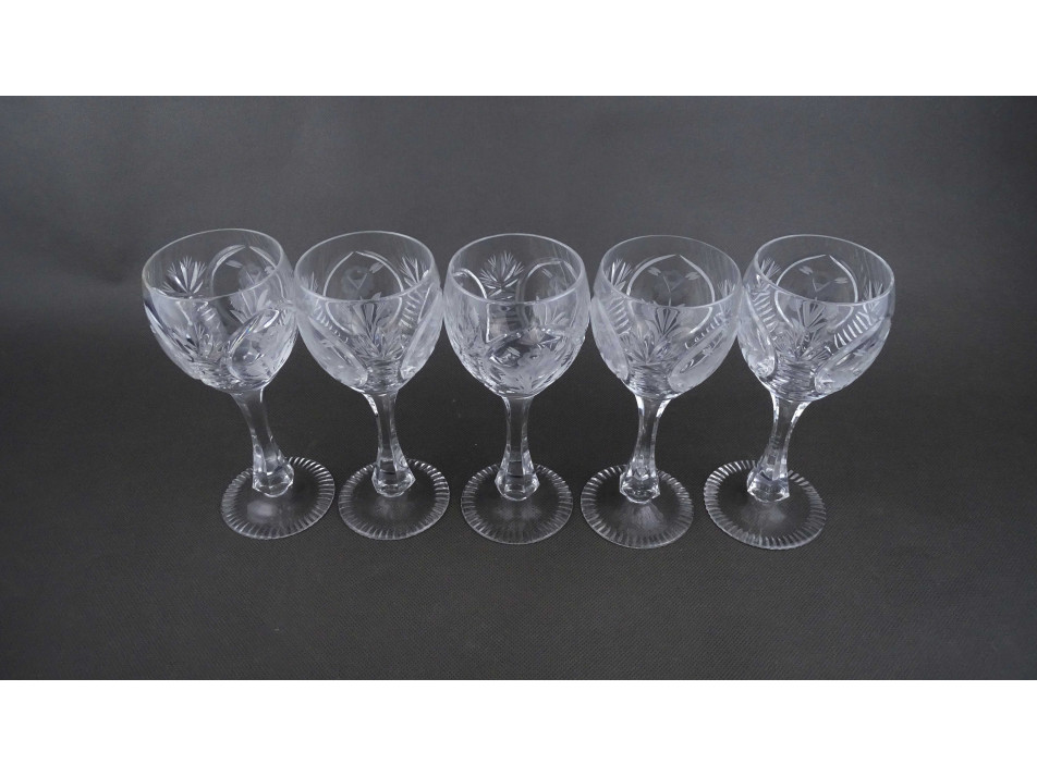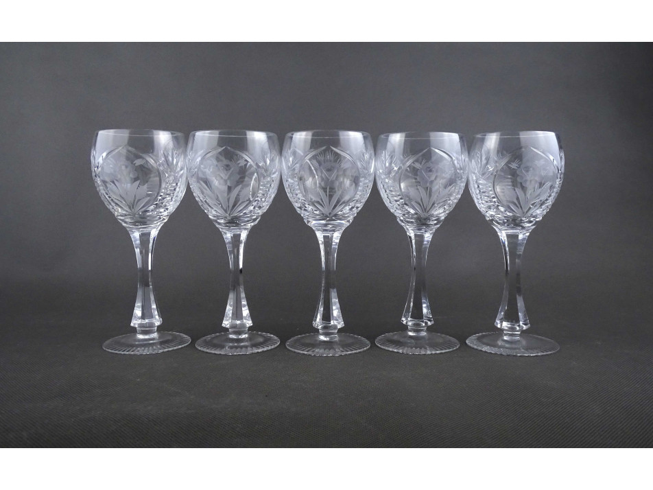 Hibátlan állapotú, gazdagon csiszolt, rózsával díszített, kristály talpas boros pohár készlet, öt darab.