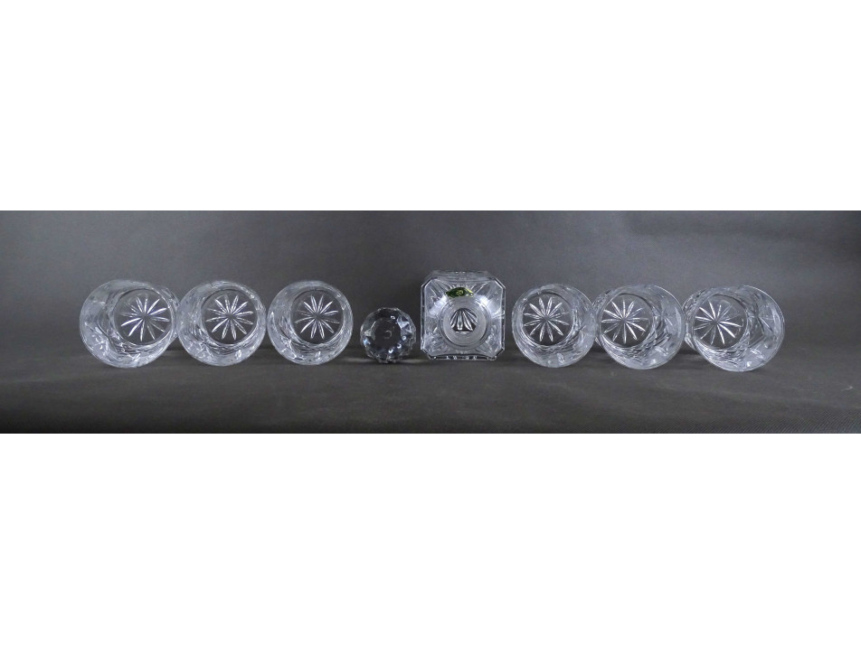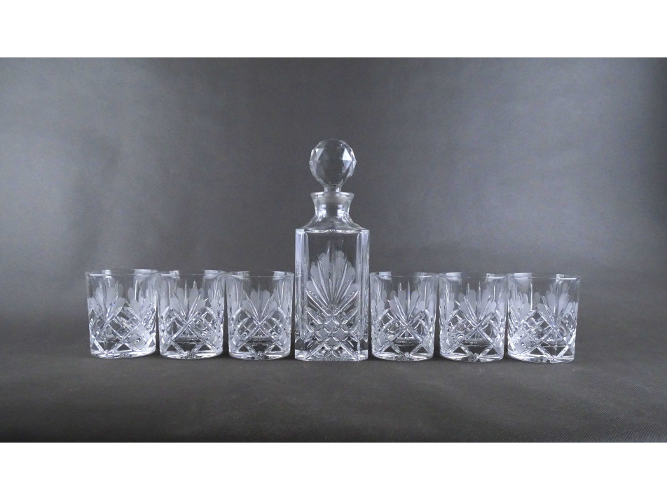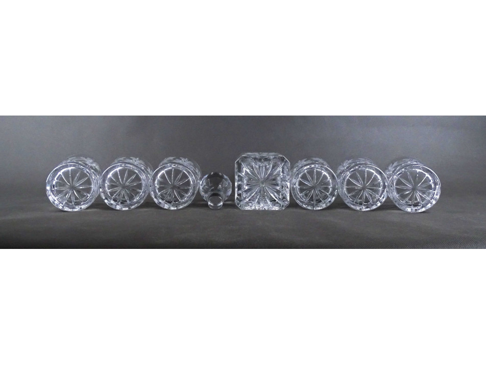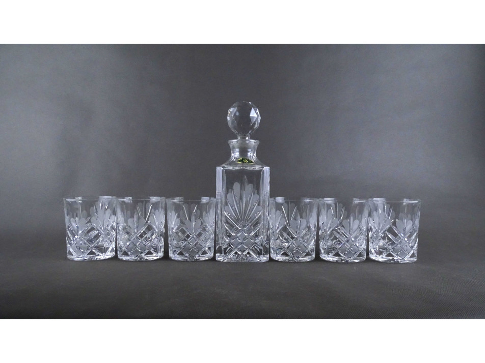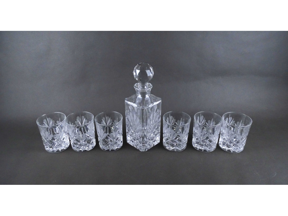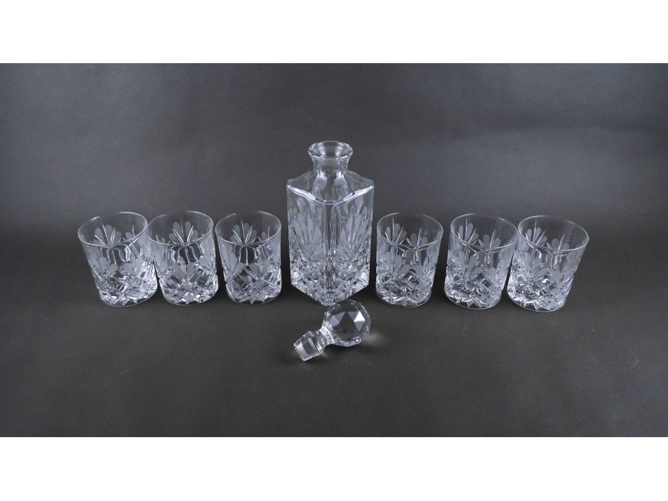 Régi, hibátlan állapotú, csiszolatokkal díszített kristály whiskey kínáló üveg, jól záró nagyméretű dugóval és a hozzá tartozó, azonos díszítésű hat darabos whiskey-s pohár készlettel.