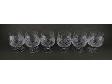 Régi szép állapotú, kisméretű színezett üveg talpas, pálinkás, stampedlis röviditalos üveg pohár. Körben csiszolt virág díszítésekkel.
