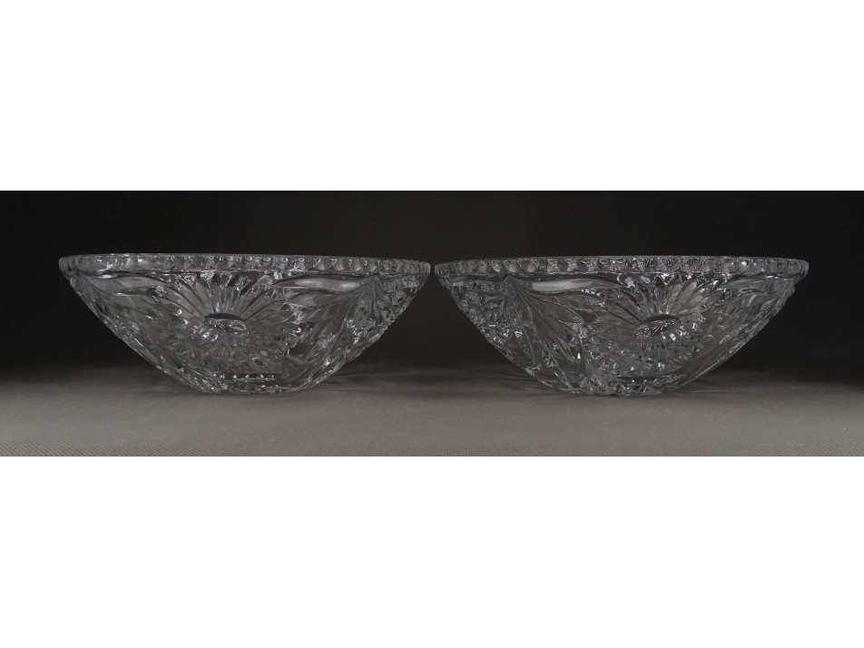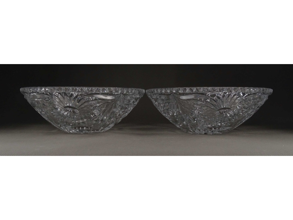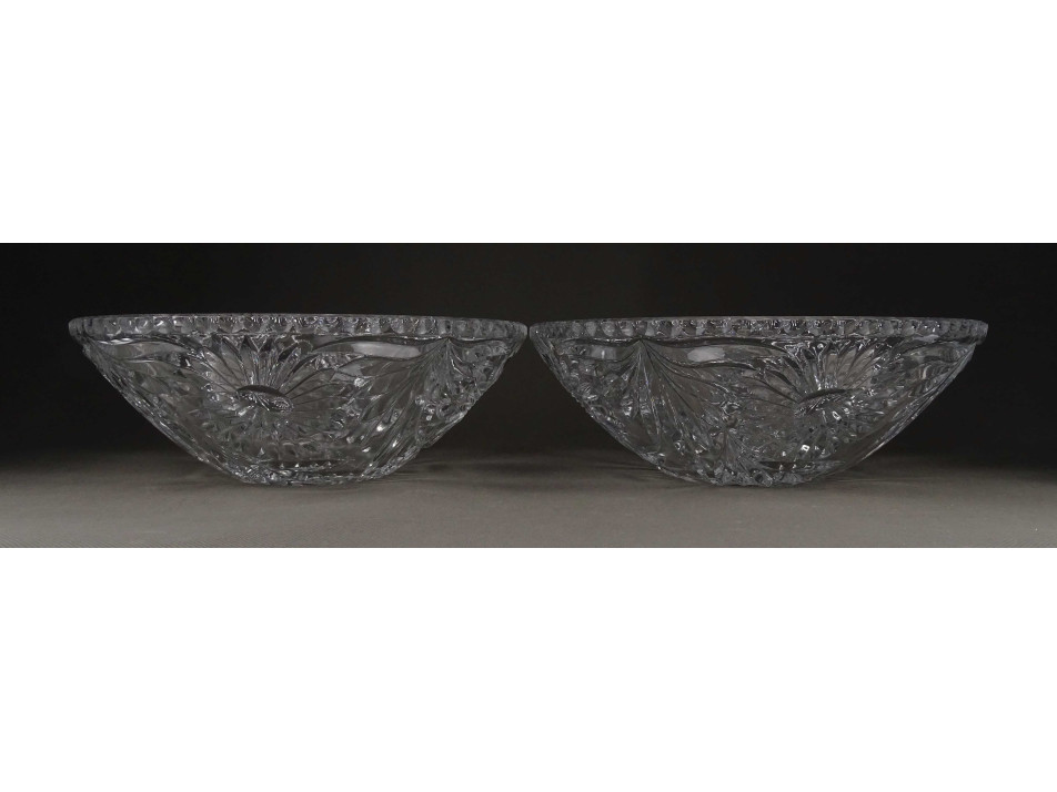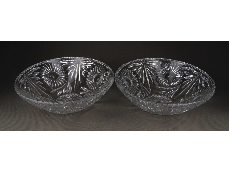2 darab, egyforma, hibátlan állapotú, csiszolatokkal gazdagon díszített, vastag falú, nagyméretű asztalközép kínáló tál, gyümölcskínáló tál.