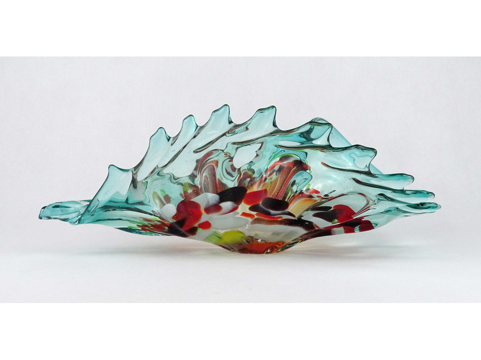 Hibátlan állapotú, különleges kagyló formájú, színes muranoi fújt üveg, kézműves üveg dísztál, kínáló tál, asztalközép.