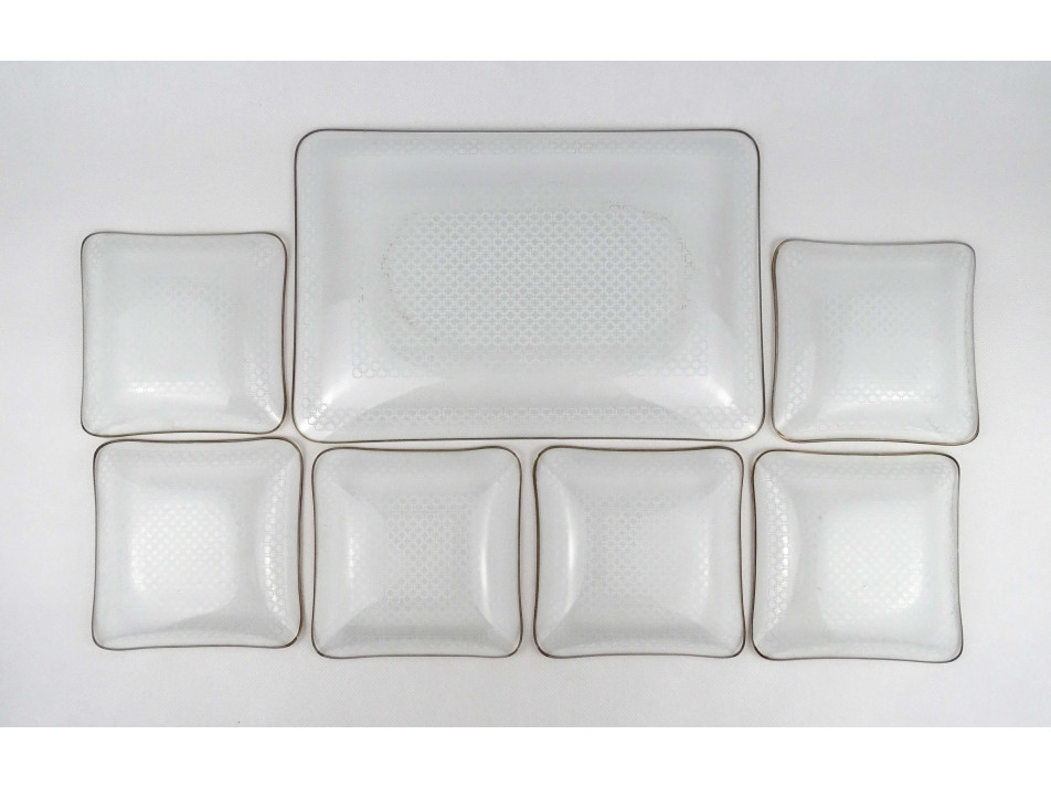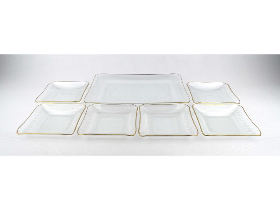 Retro, hibátlan állapotú, hat személyes, szögletes alakú, vékonyfalú, aranyozott peremű, mid century design festett üveg süteményes készlet, 7 darab.