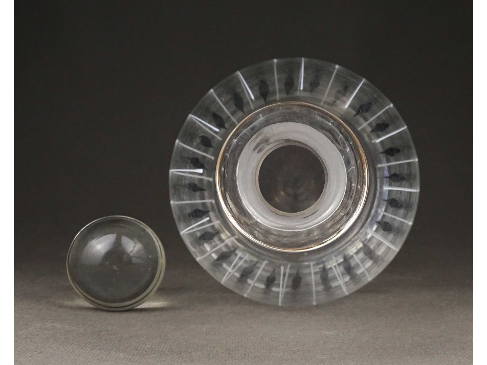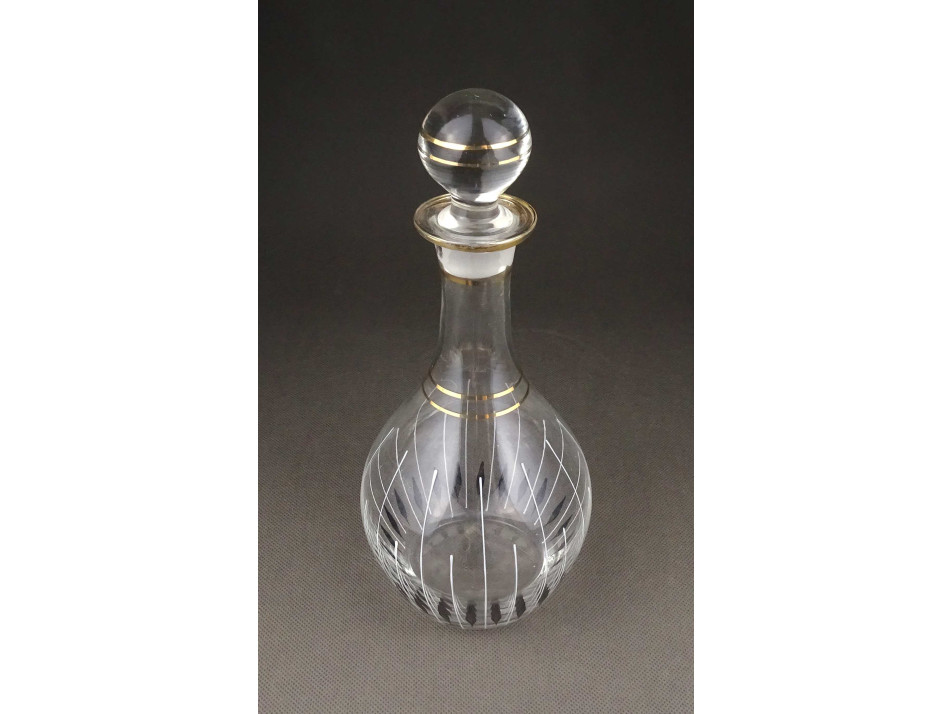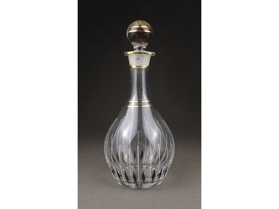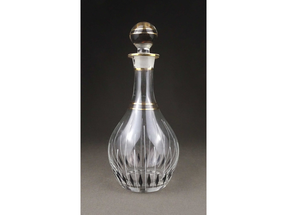 Retro, hibátlan állapotú, asztali bor, likőr vagy pálinka kínáló üveg palack. Kisméretű dugósüveg. Oldalát festett, aranyozott díszítések láthatók.