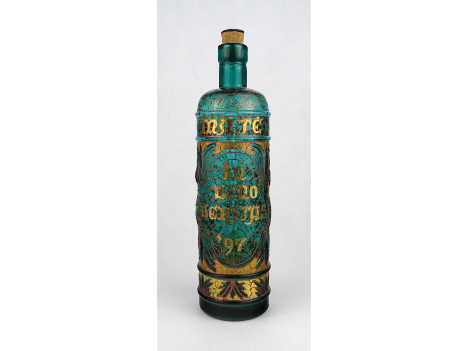 Látványos türkiz - arany IN VINO VERITAS feliratú kézműves festett boros palack 29 cm