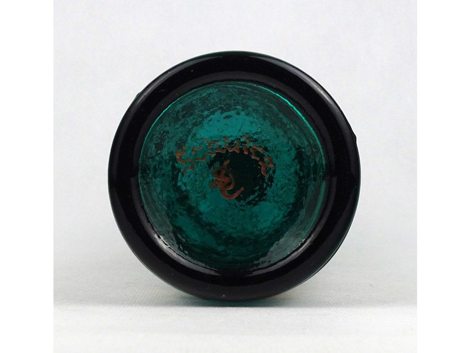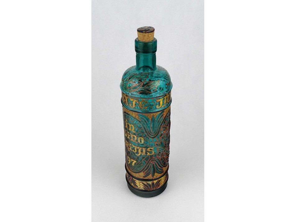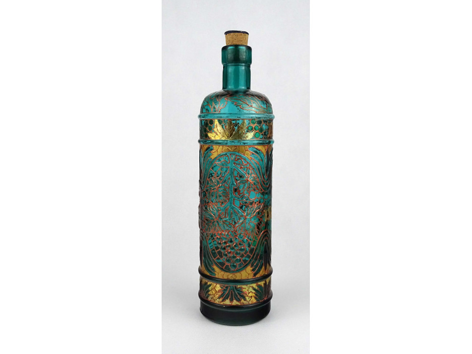 Kézműves, festett üveg italos palack. Teljes felületén aprólékos szőlő és szőlőlevél mintával borított, türkiz zöld - arany színű üvegfestékkel, kézzel festett üveg boros palack, kézműves lakberendezési tárgy.