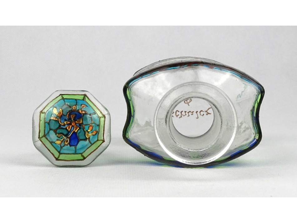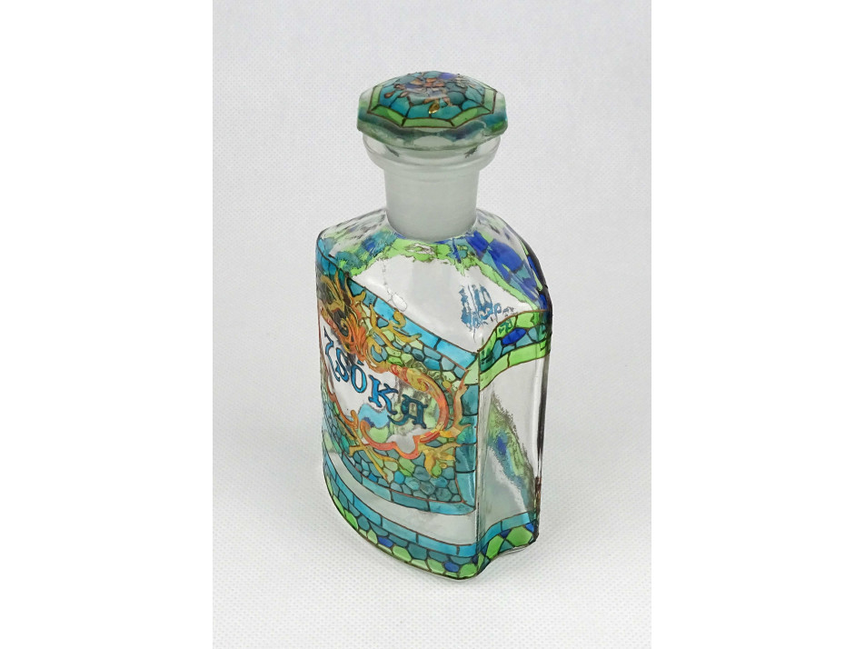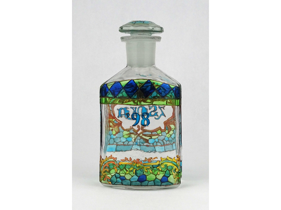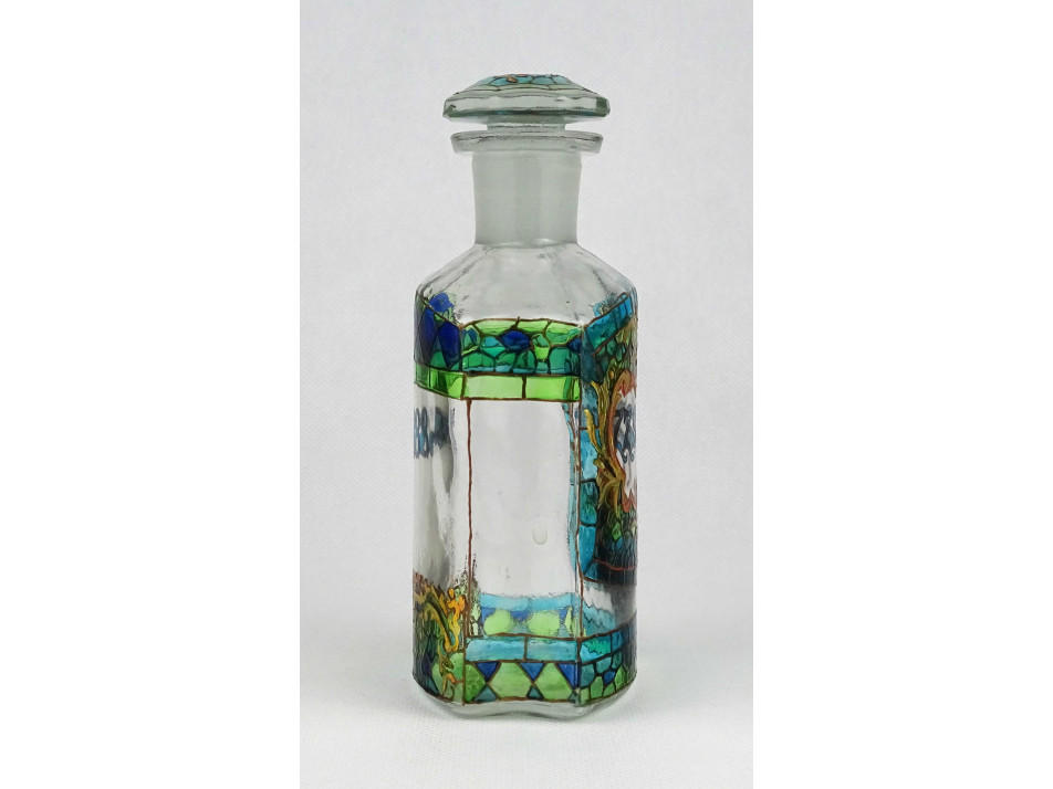 Kézműves festett patika üveg. Teljes felületén aprólékos mintával borított, kék - türkiz - zöld - arany színű üvegfestékkel, kézzel festett üveg palack, kézműves lakberendezési tárgy.