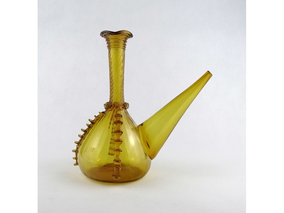 Borotyánsárga színű történelmi jellegű kézműves fújtüveg kiöntő