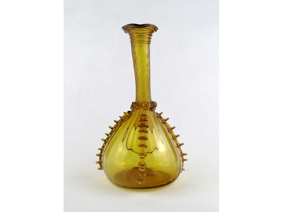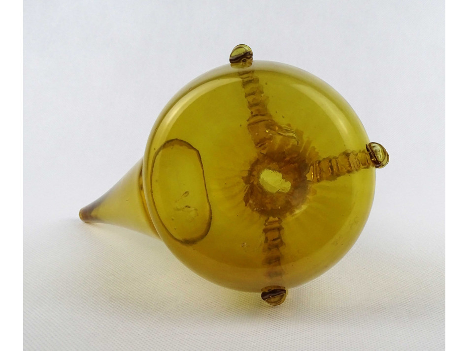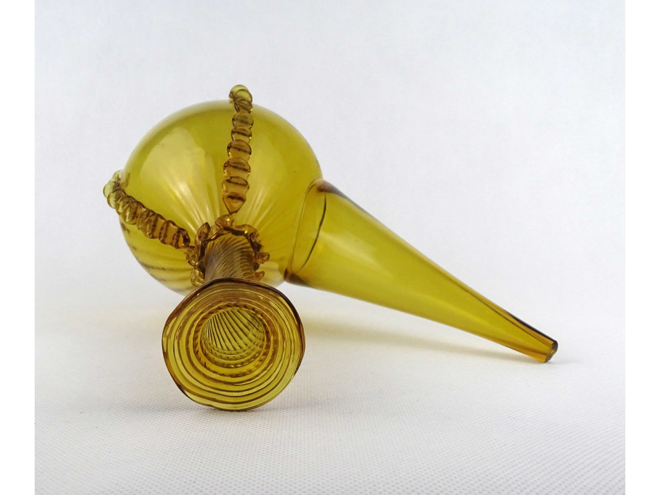 Gyönyörű, borostyánsárga színű kézműves fújtüveg kiöntő, díszüveg. Történelmi üvegeket idéző kézműves rátét, mintákkal díszített, vékonyfalú fújt üveg tárgy. Az alján a fújtüvegekre jellemző szakításnyommal.
