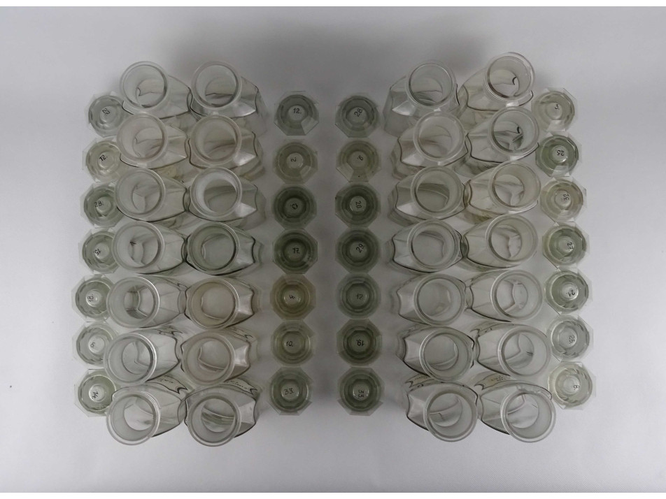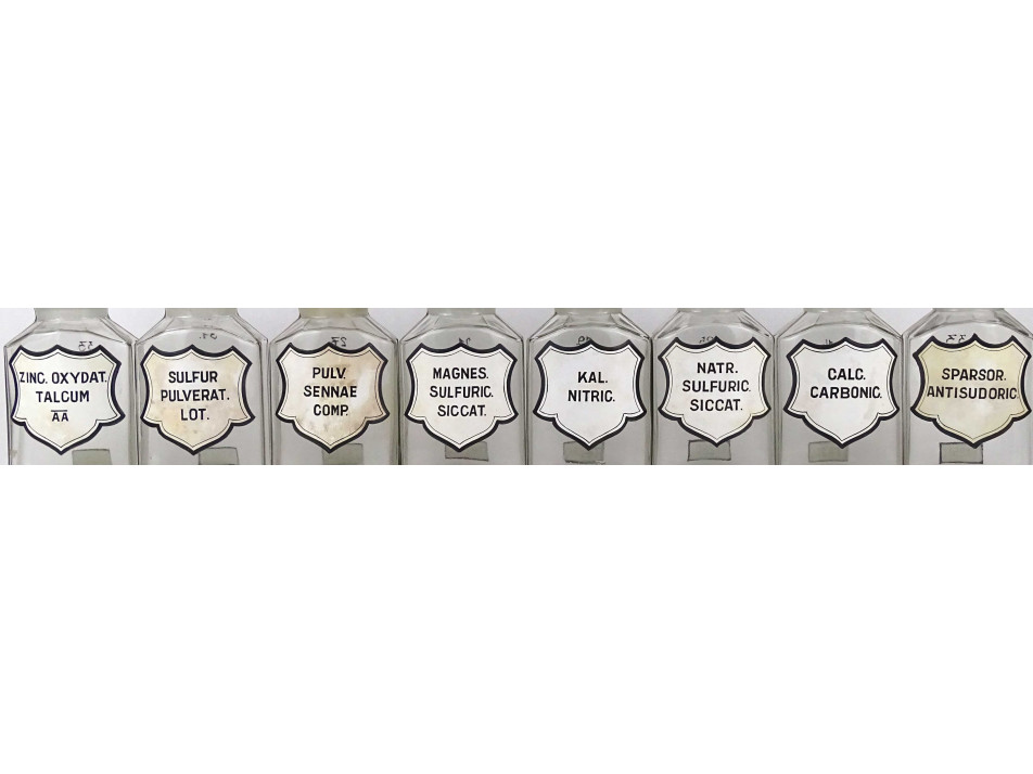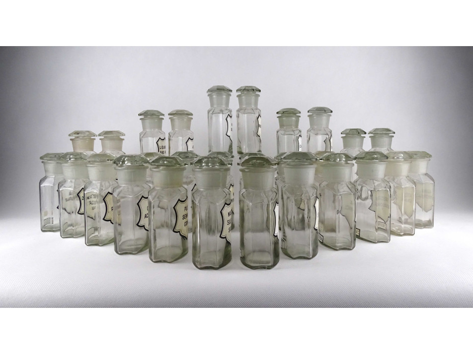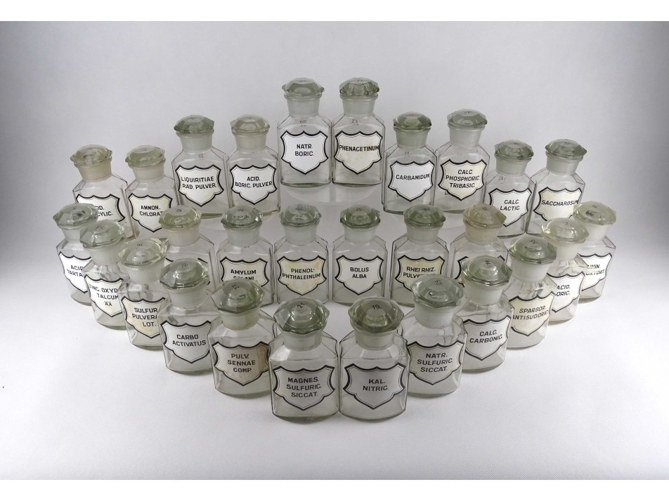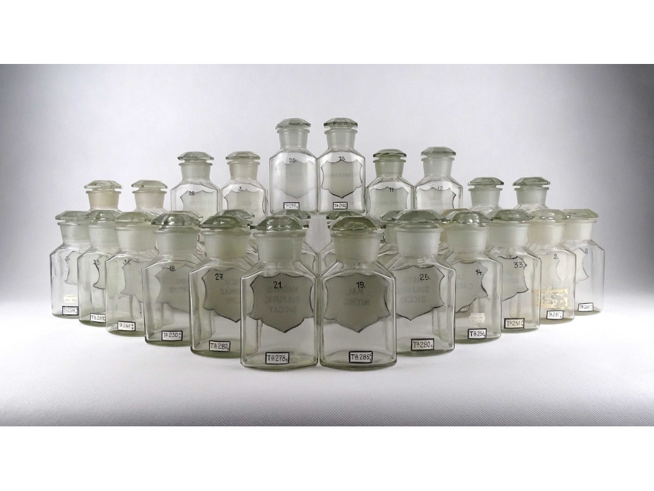 Régi, hibátlan állapotú, nagyméretű csiszolt dugós gyógyszertári üveg, patikaüveg csomag. 28 darab különböző feliratú patika tégely.