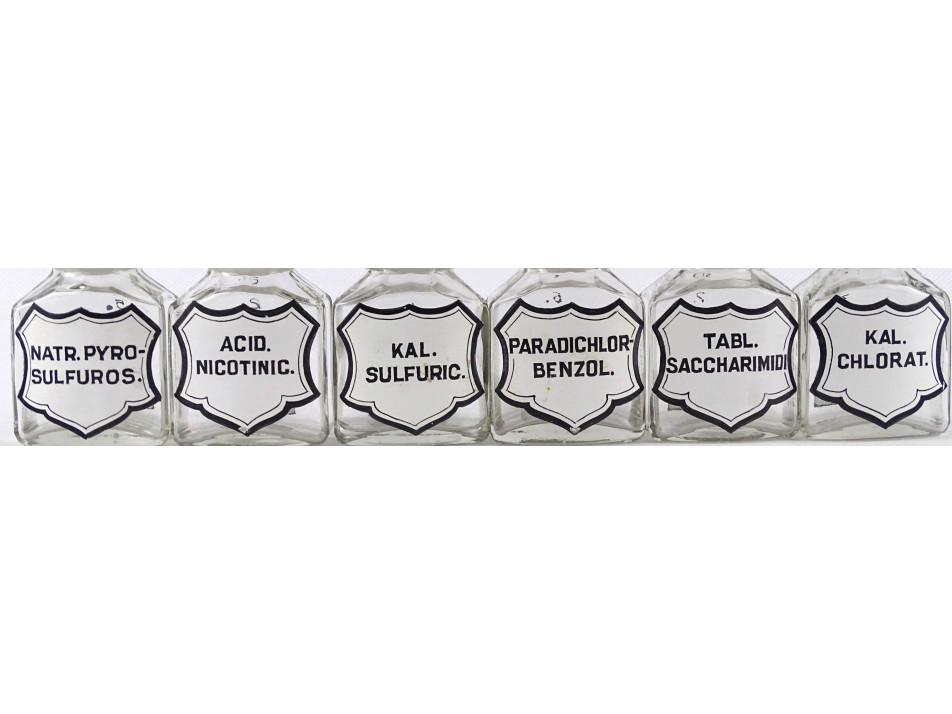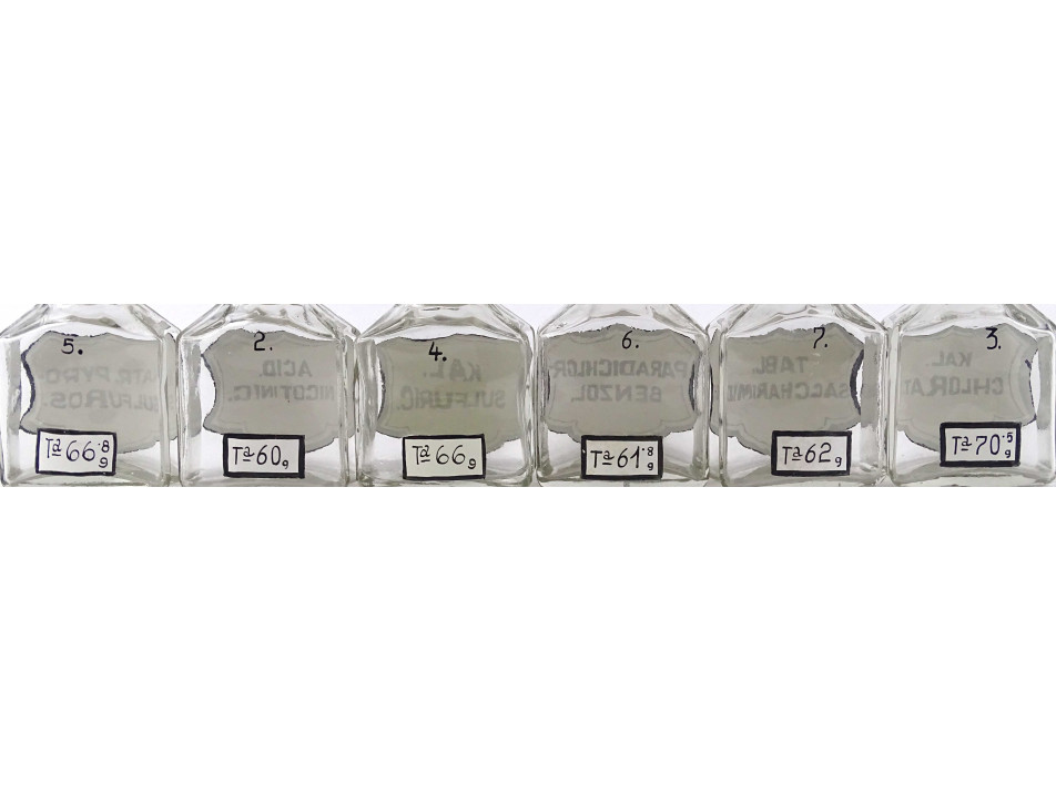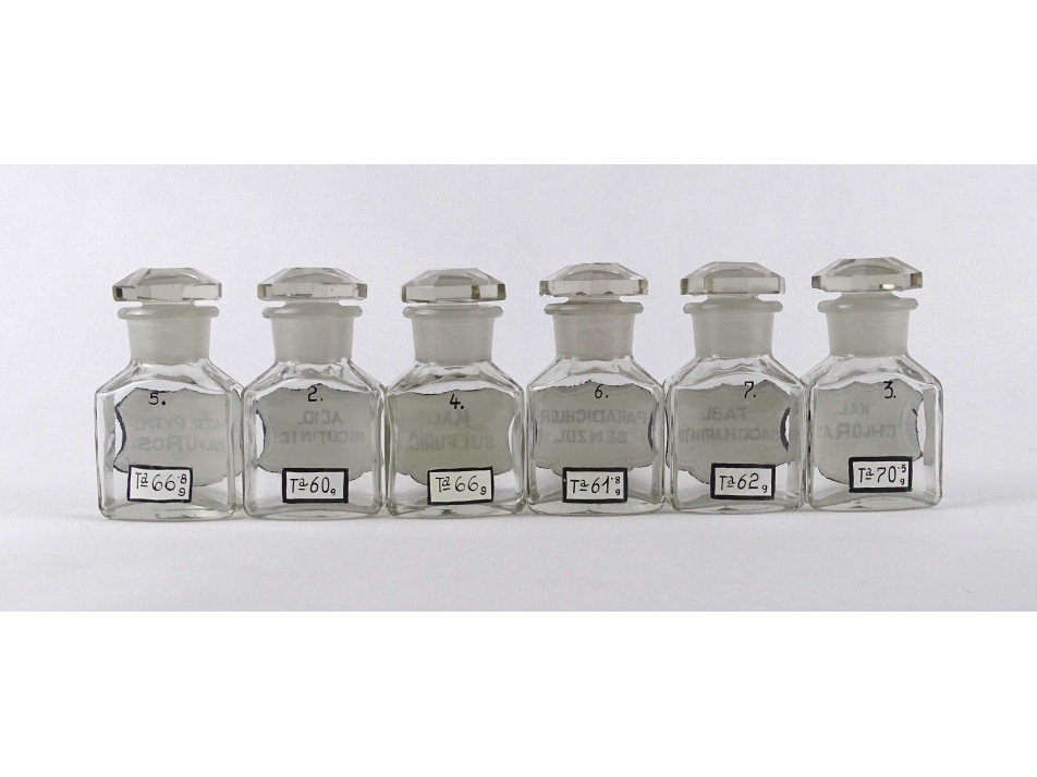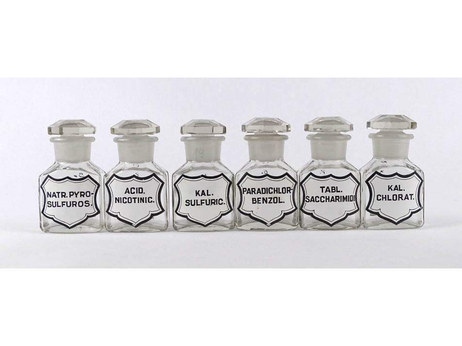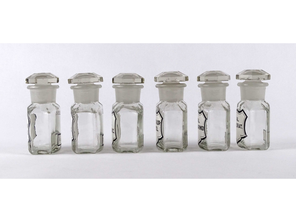 Régi, hibátlan állapotú, kisméretű, átlátszó, csiszolt dugós gyógyszertári üveg, patikaüveg csomag. 6 darab különböző feliratú patika tégely.