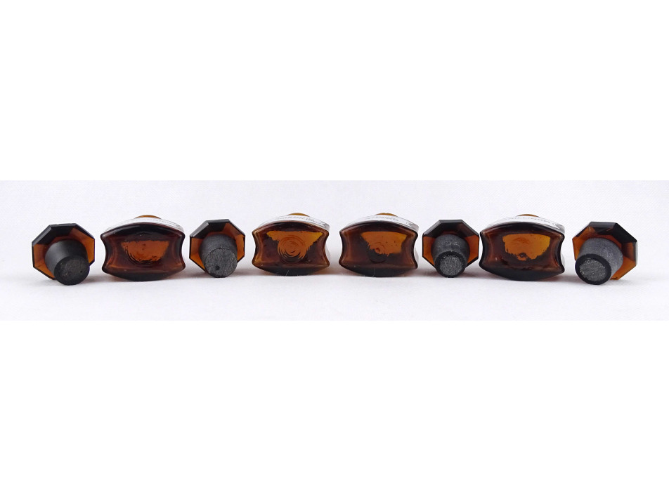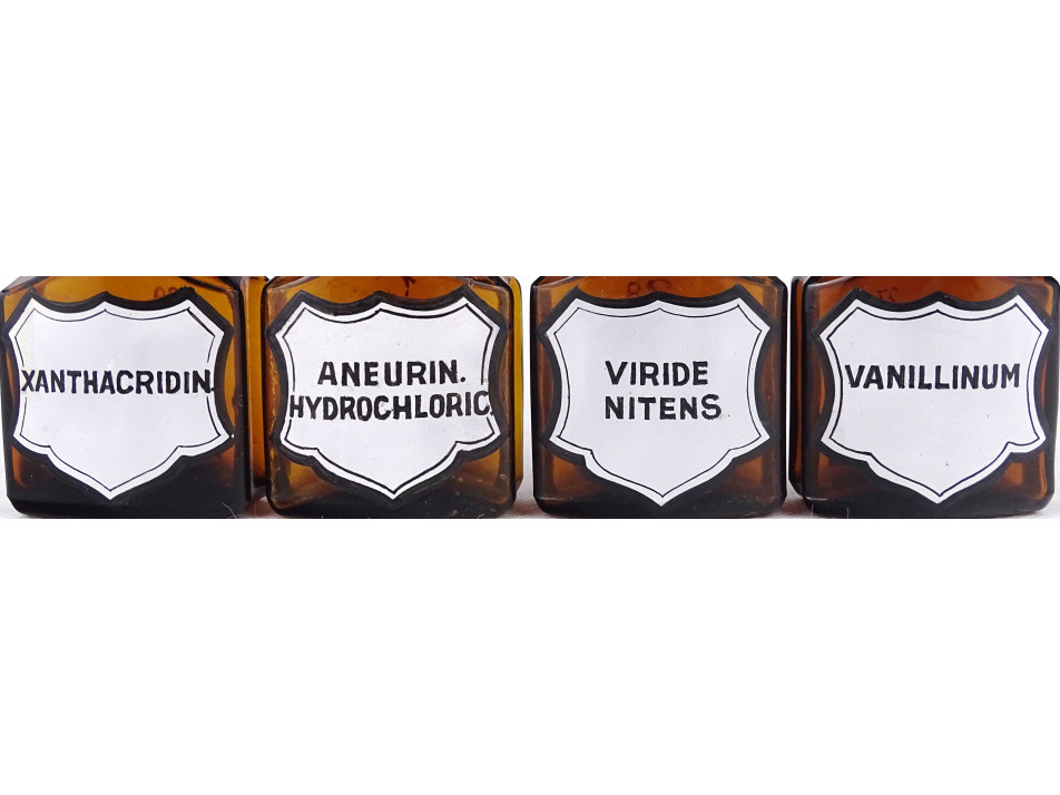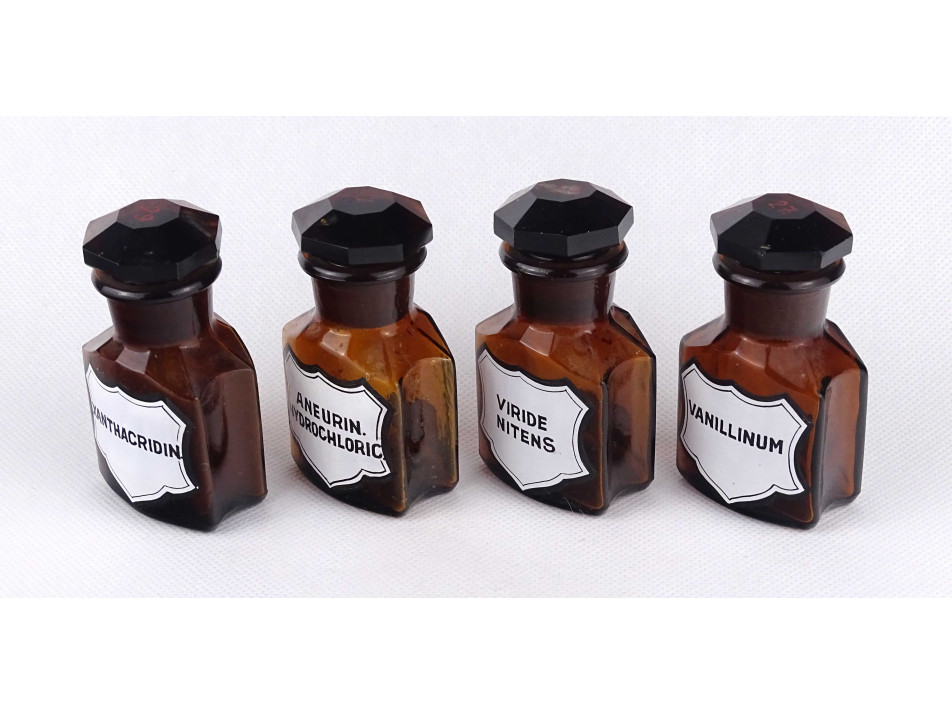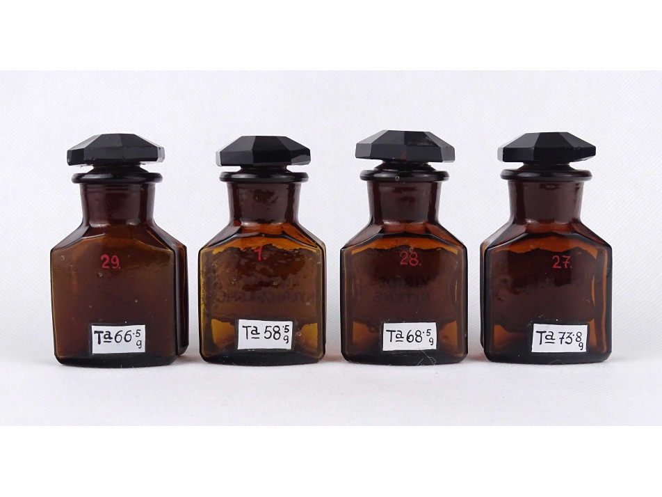 Régi, hibátlan állapotú, kisméretű, barna színű, csiszolt dugós gyógyszertári üveg, patikaüveg csomag. 4 darab különböző feliratú patika tégely.