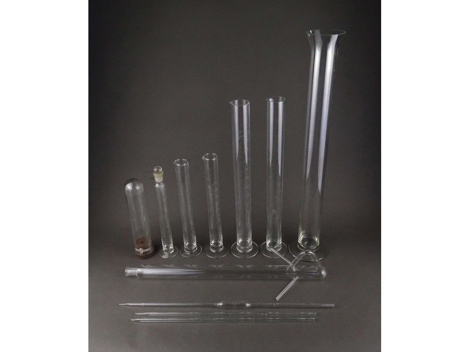 Régi laboratóriumi üveg eszköz csomag. Lombik üvegek, mérőpoharak, talpas mérő edények, pipetták, lezárt üvegcsék, sok kiegészítő gyógyszertári laboratóriumból. 11 darab egyben.