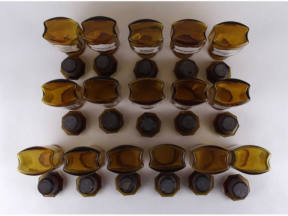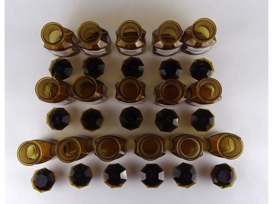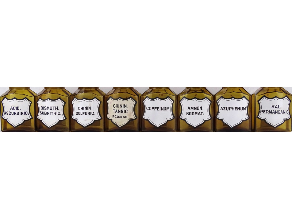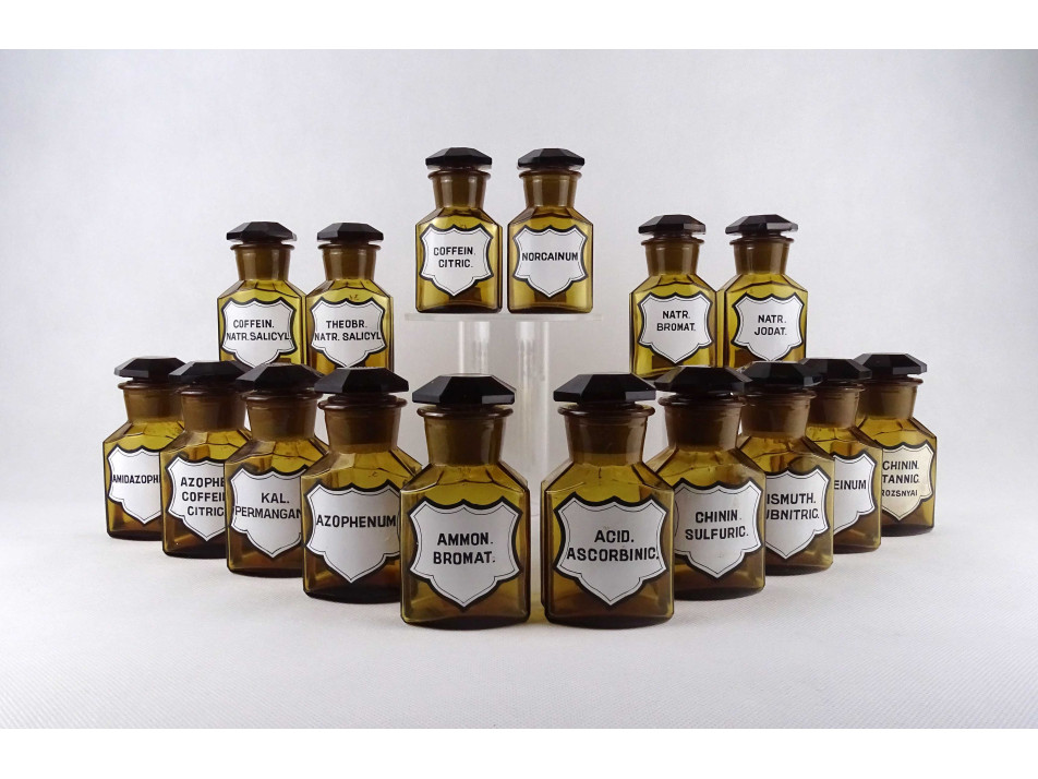 Régi, hibátlan állapotú, nagyméretű, barna színű, csiszolt dugós gyógyszertári üveg, patikaüveg csomag. 16 darab különböző feliratú patika tégely.