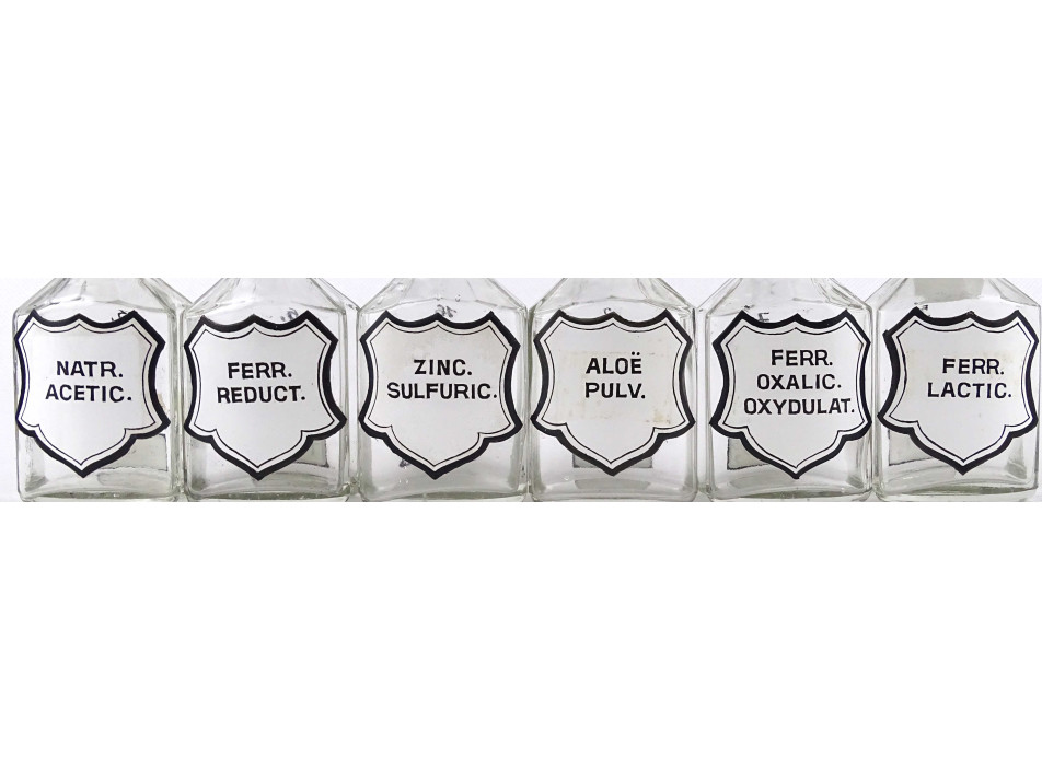 Régi, hibátlan állapotú, kisméretű, színtelen, csiszolt dugós gyógyszertári üveg, patikaüveg csomag. 12 darab különböző feliratú patika tégely.