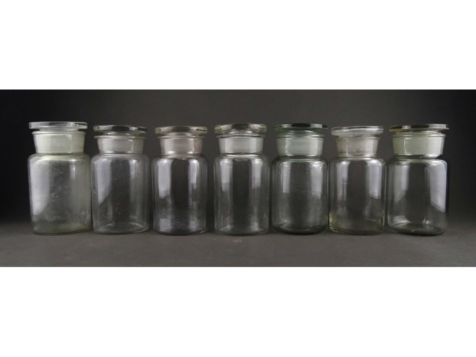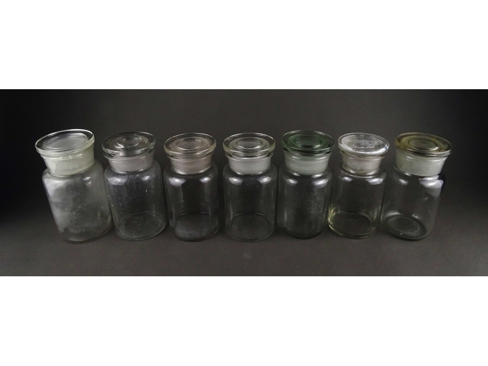 Régi, hibátlan állapotú, nagyméretű, színtelen, csiszolt dugós gyógyszertári üveg, patikaüveg csomag. 7 darab patika tégely egyben.
