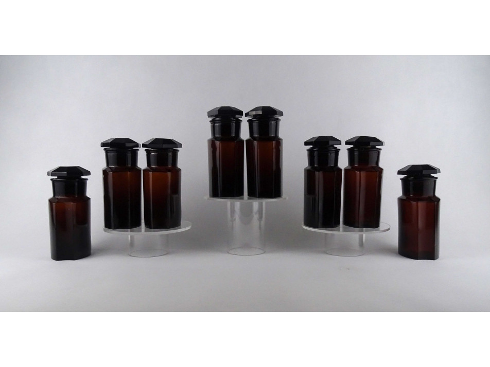 Régi, hibátlan állapotú, nagyméretű, barna színű, csiszolt dugós gyógyszertári üveg, patikaüveg csomag. 8 darab felirat nélküli patika tégely egyben.
