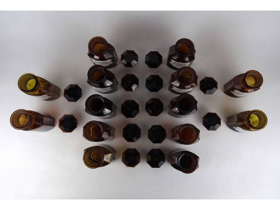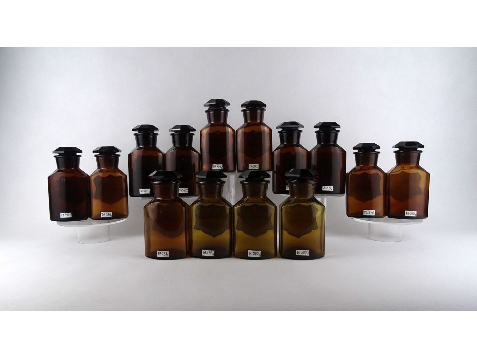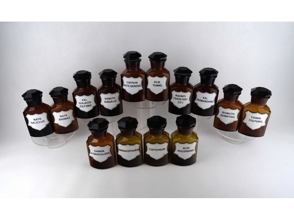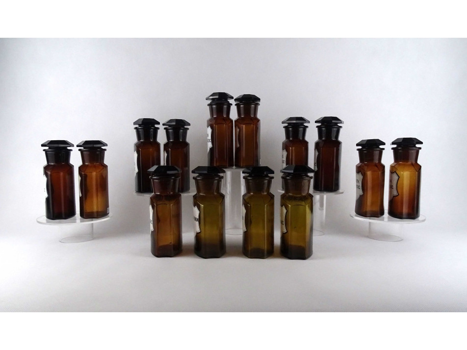 Régi, nagyméretű, barna színű, csiszolt dugós gyógyszertári üveg, patikaüveg csomag. 14 darab különböző feliratú patika tégely.