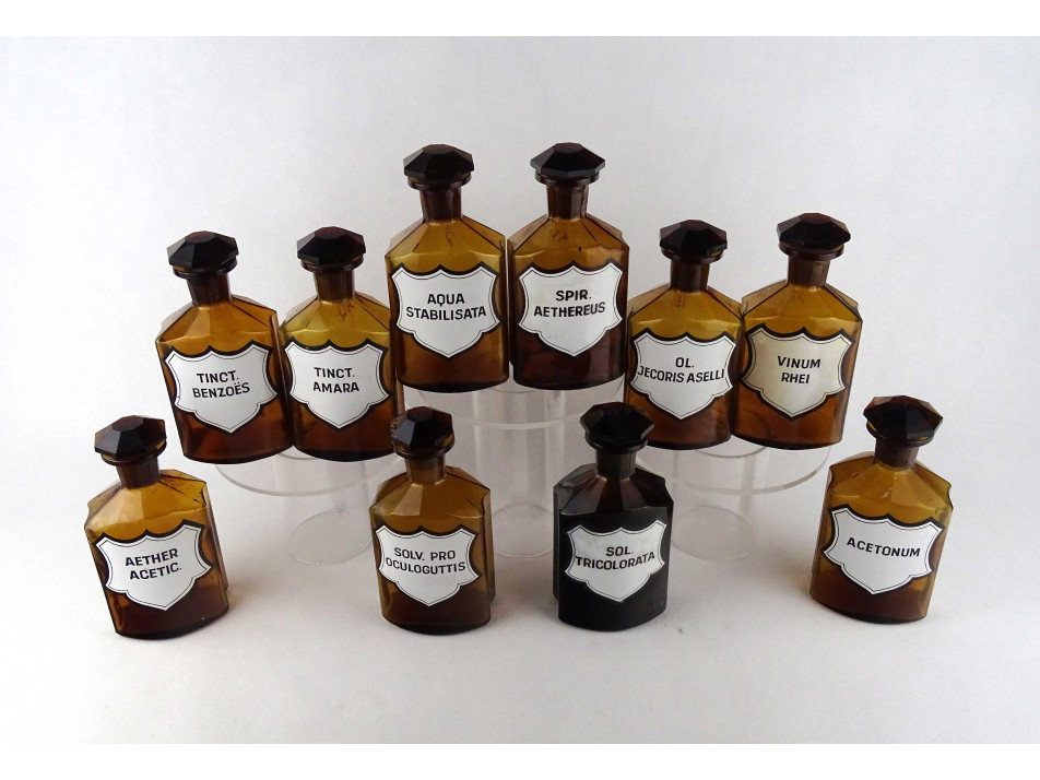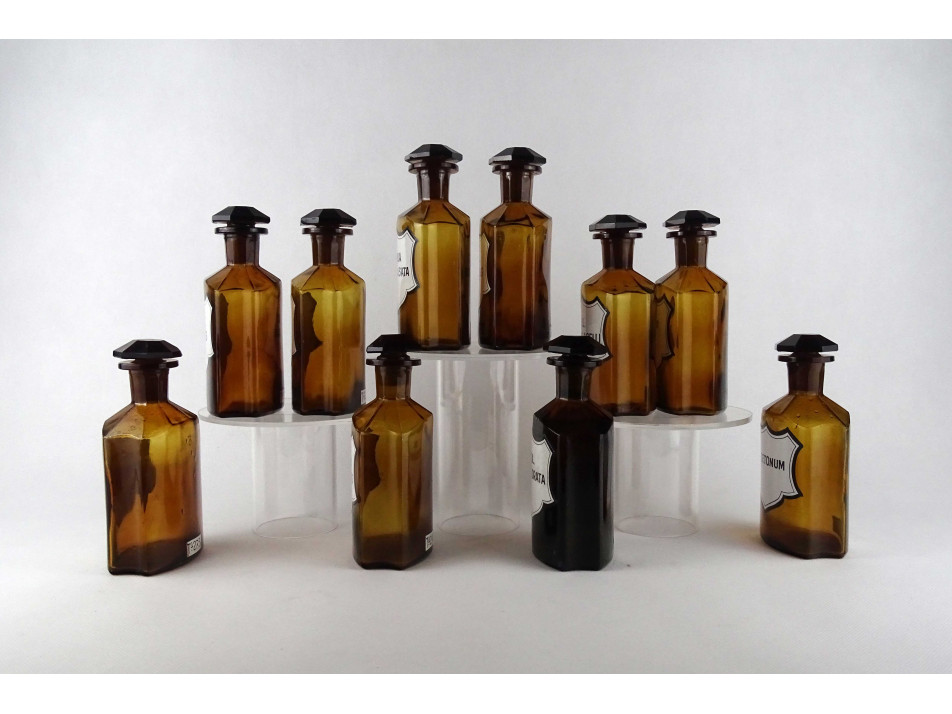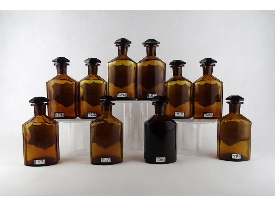 Régi, nagyméretű, barna színű, keskeny nyakú, csiszolt dugós gyógyszertári üveg, patikaüveg csomag. 10 darab különböző feliratú patika tégely.
