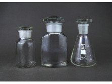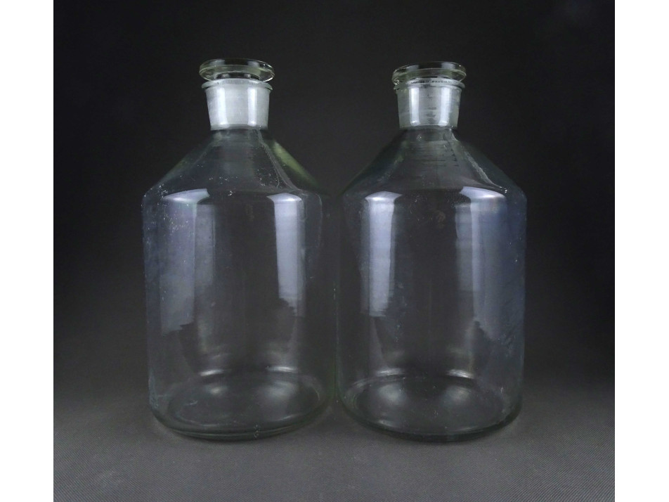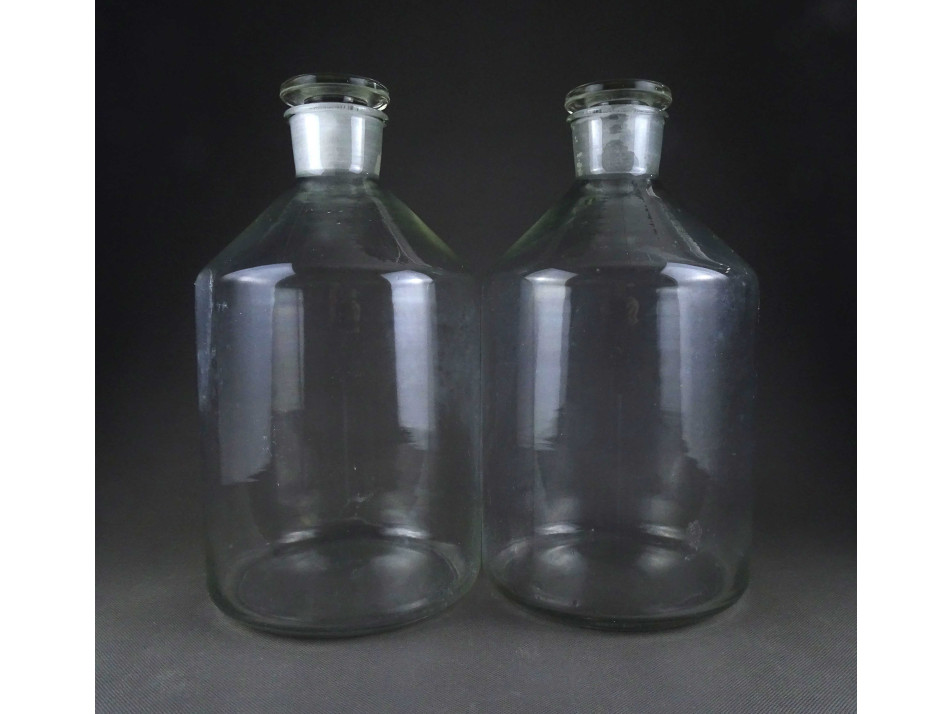 2 darab, régi, hibátlan állapotú, nagyméretű, csiszolt dugós színtelen patika üveg, gyógyszerészeti tároló üveg ballon. Körülbelül 5 literesek lehetnek.