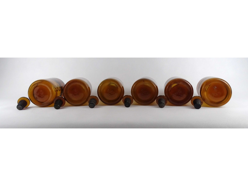 Régi, hibátlan állapotú, nagyméretű, 1 literes, barna színű, csiszolt dugós gyógyszertári üveg, patika üveg palack csomag. 6 darab egyben.