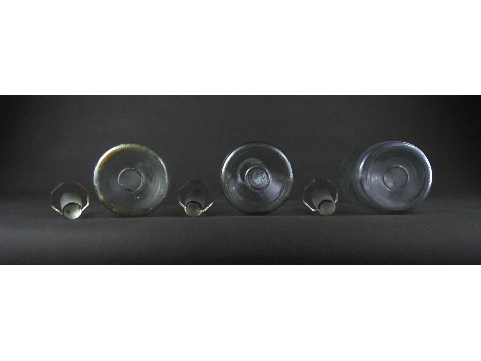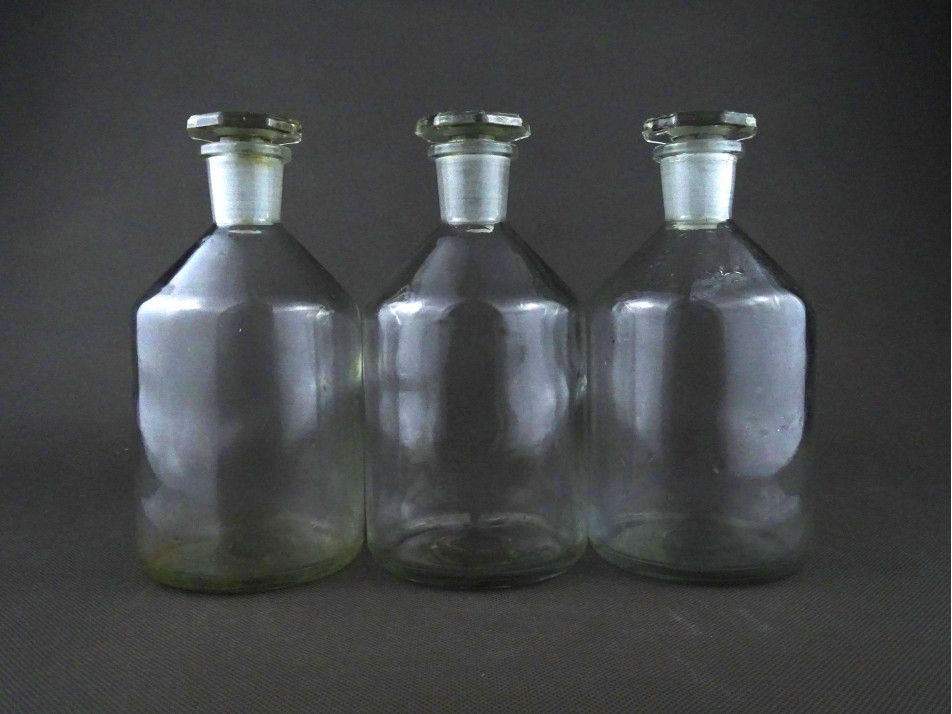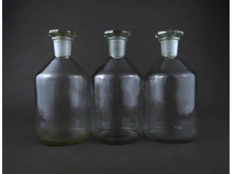 Régi, hibátlan állapotú, áttetsző, csiszolt dugós patika üveg, gyógyszerészeti tároló üveg csomag, három darab egyben. Aljukon felirat: 500