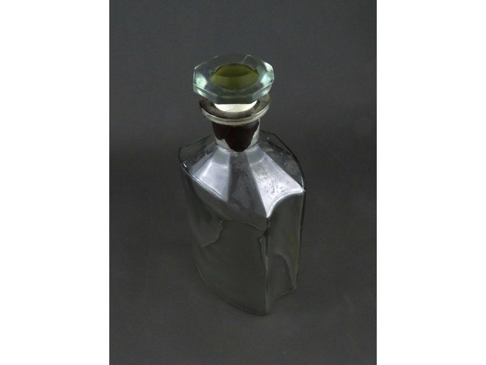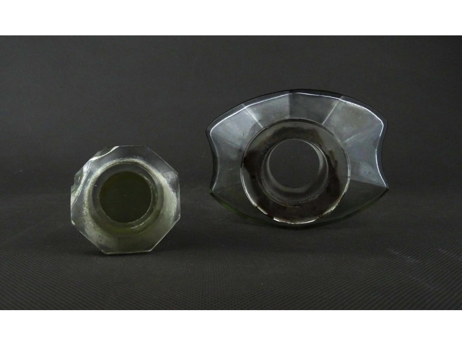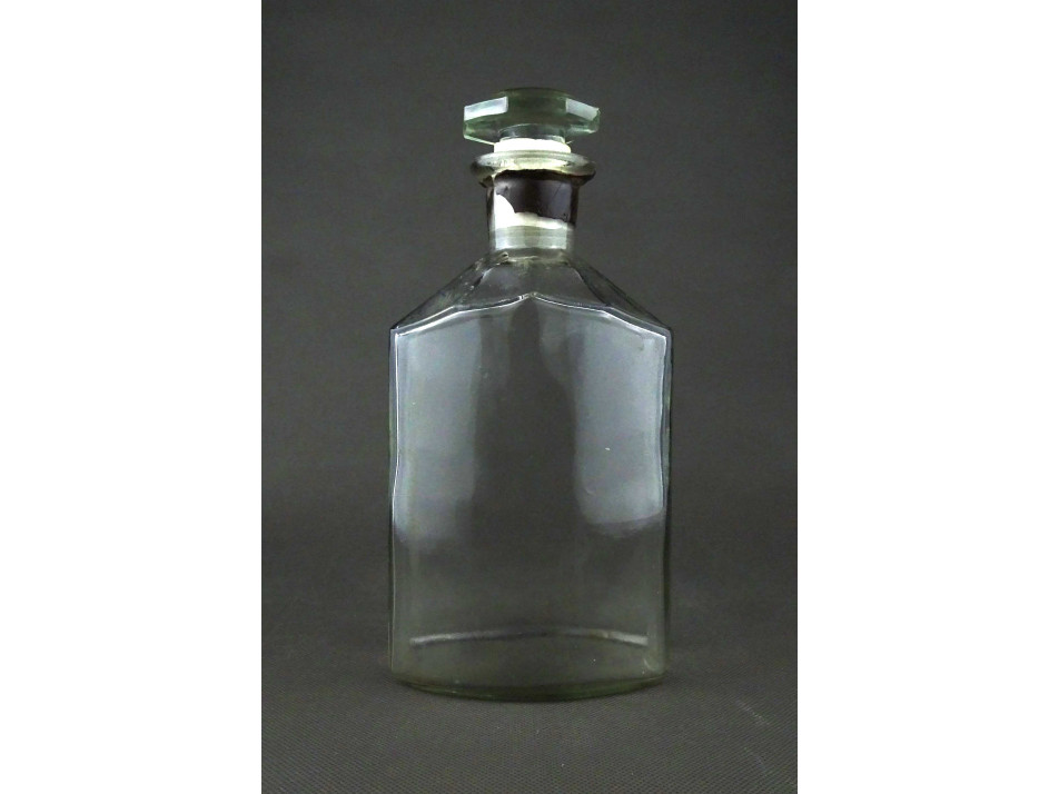 Régi, szép állapotú, nagyméretű, csiszolt dugós, felirat nélküli gyógyszertári üveg, patikaüveg. Nyakán pecsétviasz maradvány, a dugó alsó peremén két lepattanás látható.