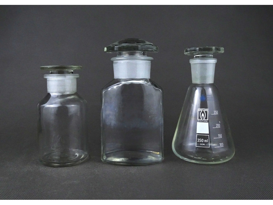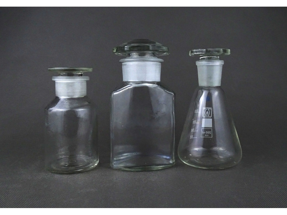 Régi, hibátlan állapotú, különböző méretű, csiszolt dugós laboratóriumi üveg, patikaüveg szett. 3 darab dugós patikai tároló edény, üvegcse.